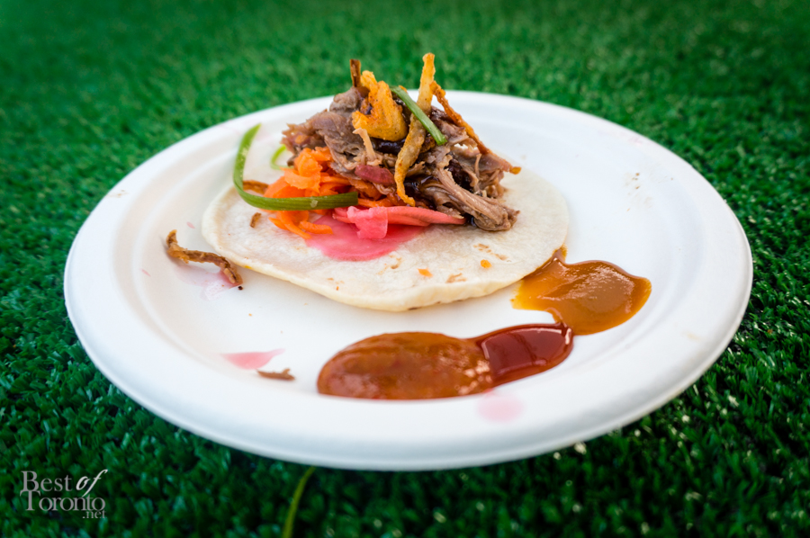 The second dish was from Barque Smokehouse – smoked duck tacos with pickled radish, carrots, crispy fried chicken skin, and a hoisin BBQ sauce on a flour tortilla.