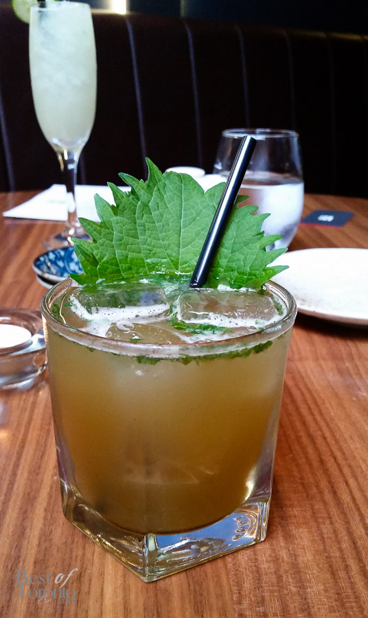 - Kyuri sake with gin, sake, yuzu sour and cucumber garnished with a shisho leaf