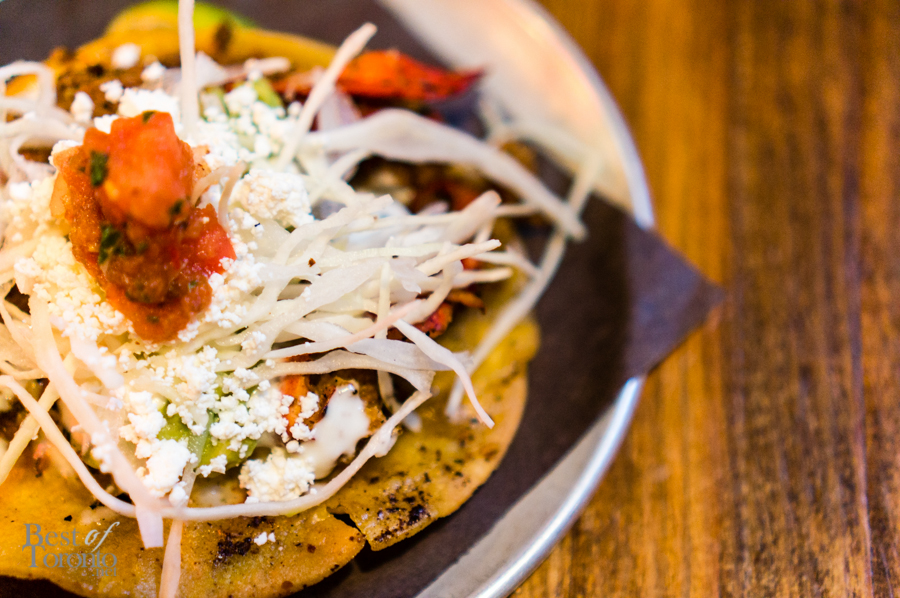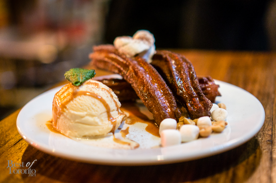 Also on the menu are Dulces (desserts) including “Churros Poutine” ($9), Sweet Milk Ice Cream ($8) and Tres Luches ($8). We tried their play on poutine for dessert: Churros Poutine with the dough for churros made in-house, drizzled with caramel, a topping of peanuts, marshmallows with a dash of whipped cream and cinnamon. It paired very well with the sweet milk ice cream.