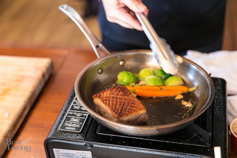 So Chef Harding went through the steps to teach us how to make pan seared duck breast with fresh herbs and vegetables. I’m developing a huge appreciation for herbs in cooking lately and Harding says he loves using thyme, so he used it here with us in this session. He said he also swears by the Vitamix food processor and we used it to make a beautiful, creamy cauliflower puree.
