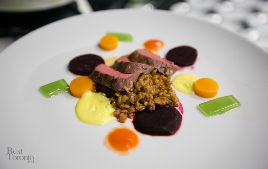 - Ontario lamb on risotto with Hollandaise sauce, Uphill Farm vegetables, and mint jelly