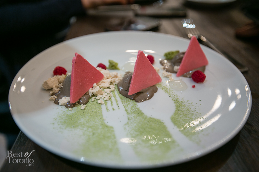 - Chocolate, passionfruit and coconut snow topped with dark chocolate raspberry twigs