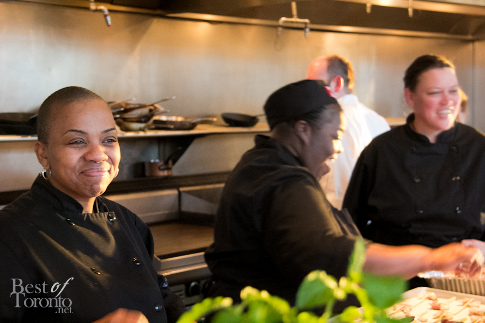 It’s no coincidence that the 3rd annual Kitchen Sisters event was held on International Women’s Day in support of Sistering, an organization that supports poor, homeless, marginalized and low-income women in Toronto. They do this by providing hot meals, emotional support and more. The program is in such high demand (currently at 400 meals a day) that the kitchen needs to be renovated to accommodate the demand. So Kitchen Sisters is a fundraising event that pays for these much-needed renovations. So on March 8th, 2013 there was an intimate 100-person gathering at the cozy Mildred’s Temple Kitchen in Liberty Village for an exquisite dining experience with a 4-course feast as follows: