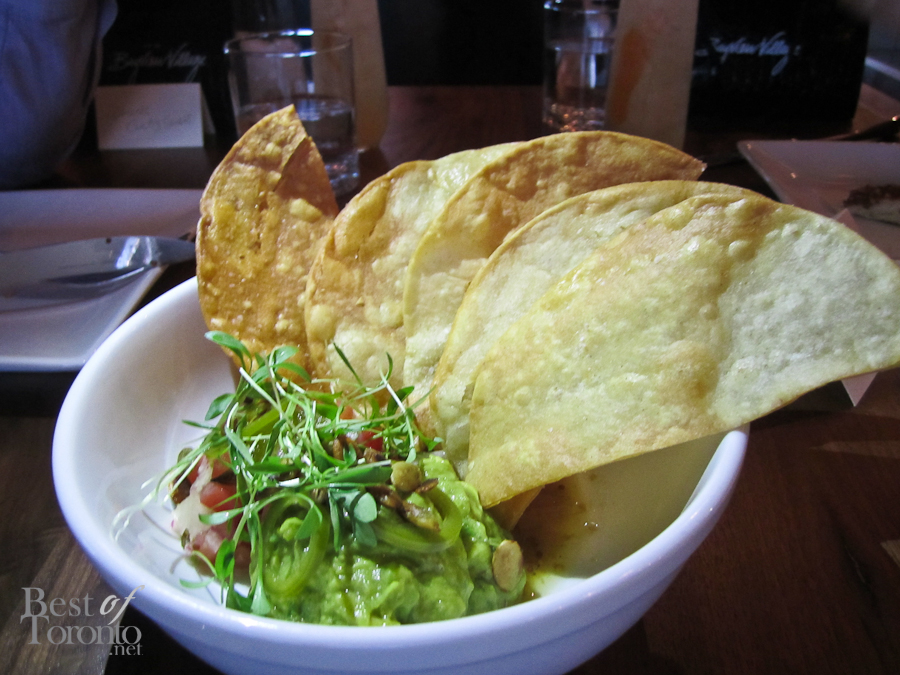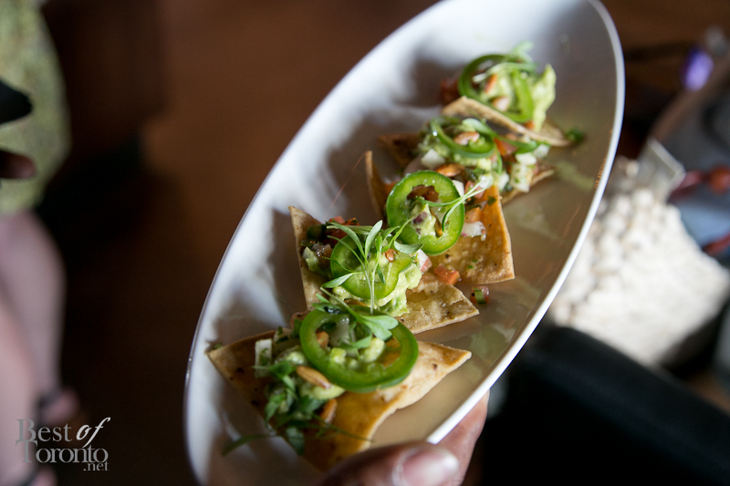 - Corn tortillas topped with guacamole, salsa, pickled jalapenos, and pumpkin seeds