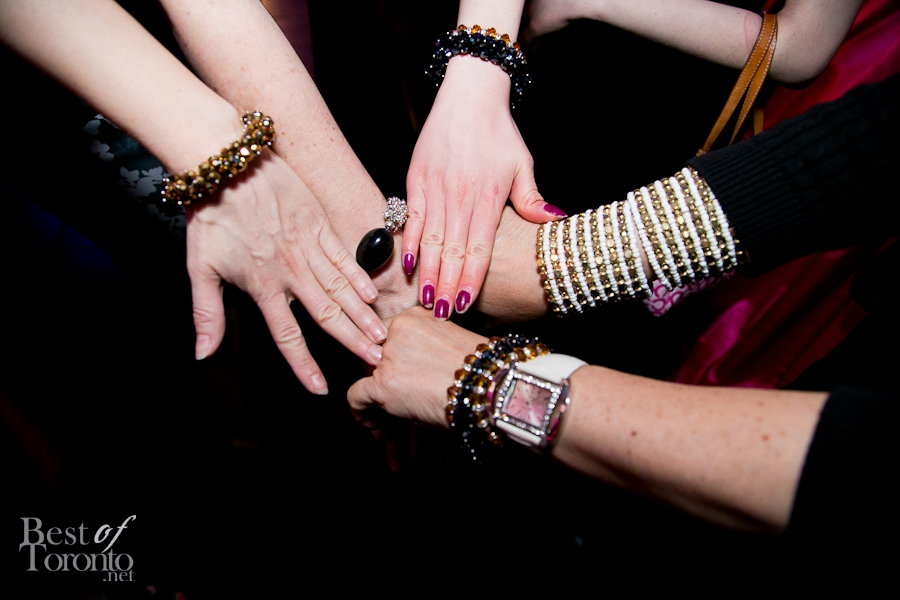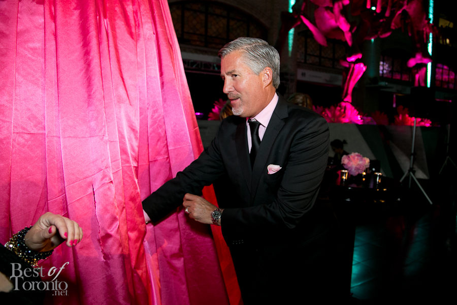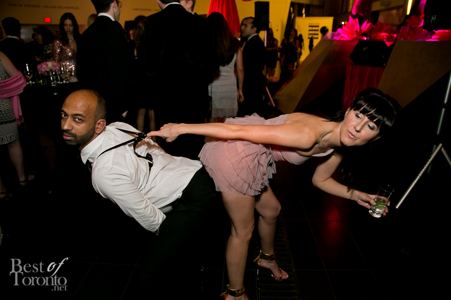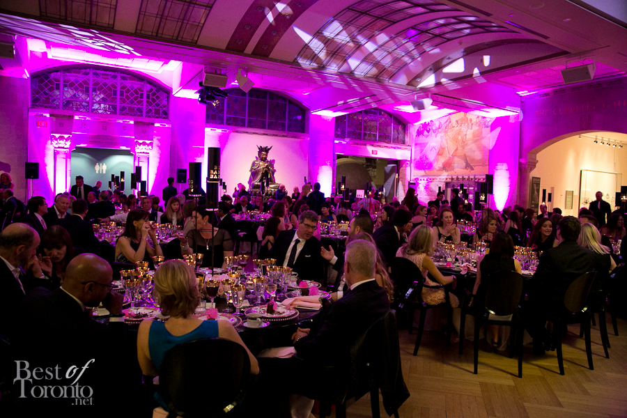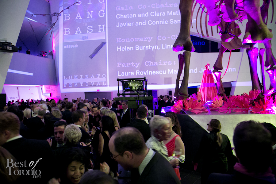 So on the evening of the Big Bang Bash, the theme was pink with a pink carpet greeting guests at the ROM’s entrance and inside there was a gigantic pink dress in honour of Viktor&Rolf with a pink leash around the neck of the gigantic dinosaur exhibit, the Futalognkosaurus, in the main lobby. What a nice touch! Guests were encouraged to stick their hand into the giant dress and, to the shock of some guests, their hands came out with bracelets.