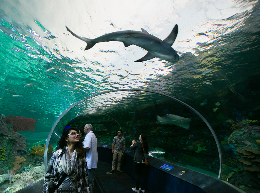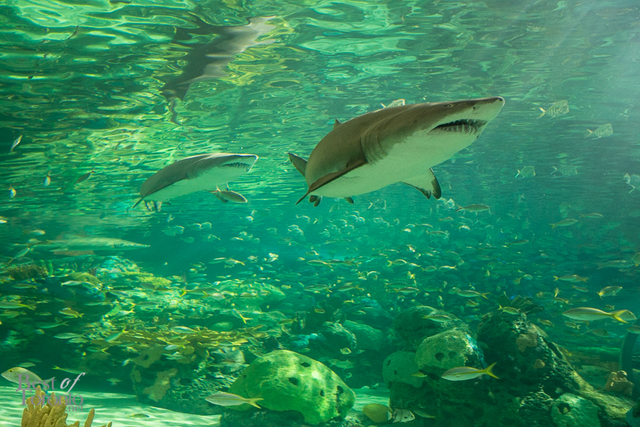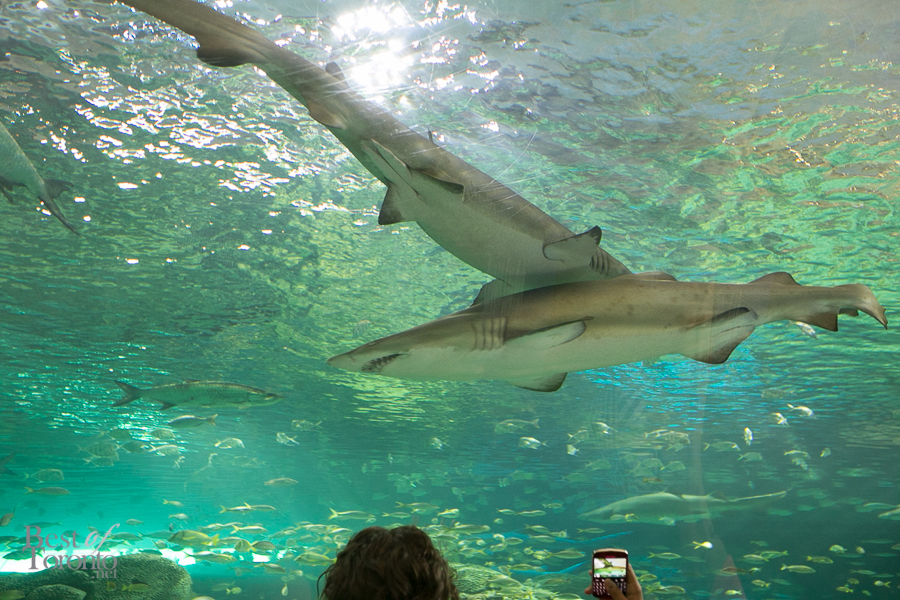 One of the main attractions is definitely the “Dangerous Lagoon”, with a glass viewing tunnel the length of a football field. Inside the tunnel there’s a moving glide-path sidewalk so you can choose to walk or stand under the swimming sharks, green sea turtles, sawfish, and moray eels.