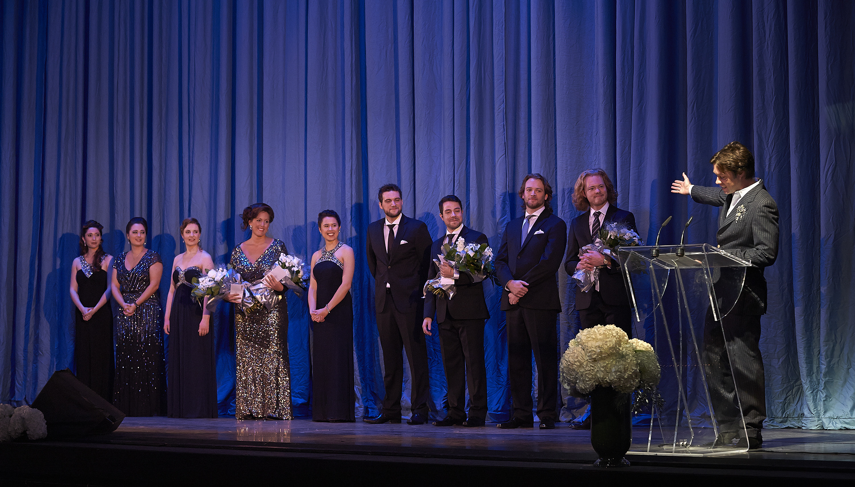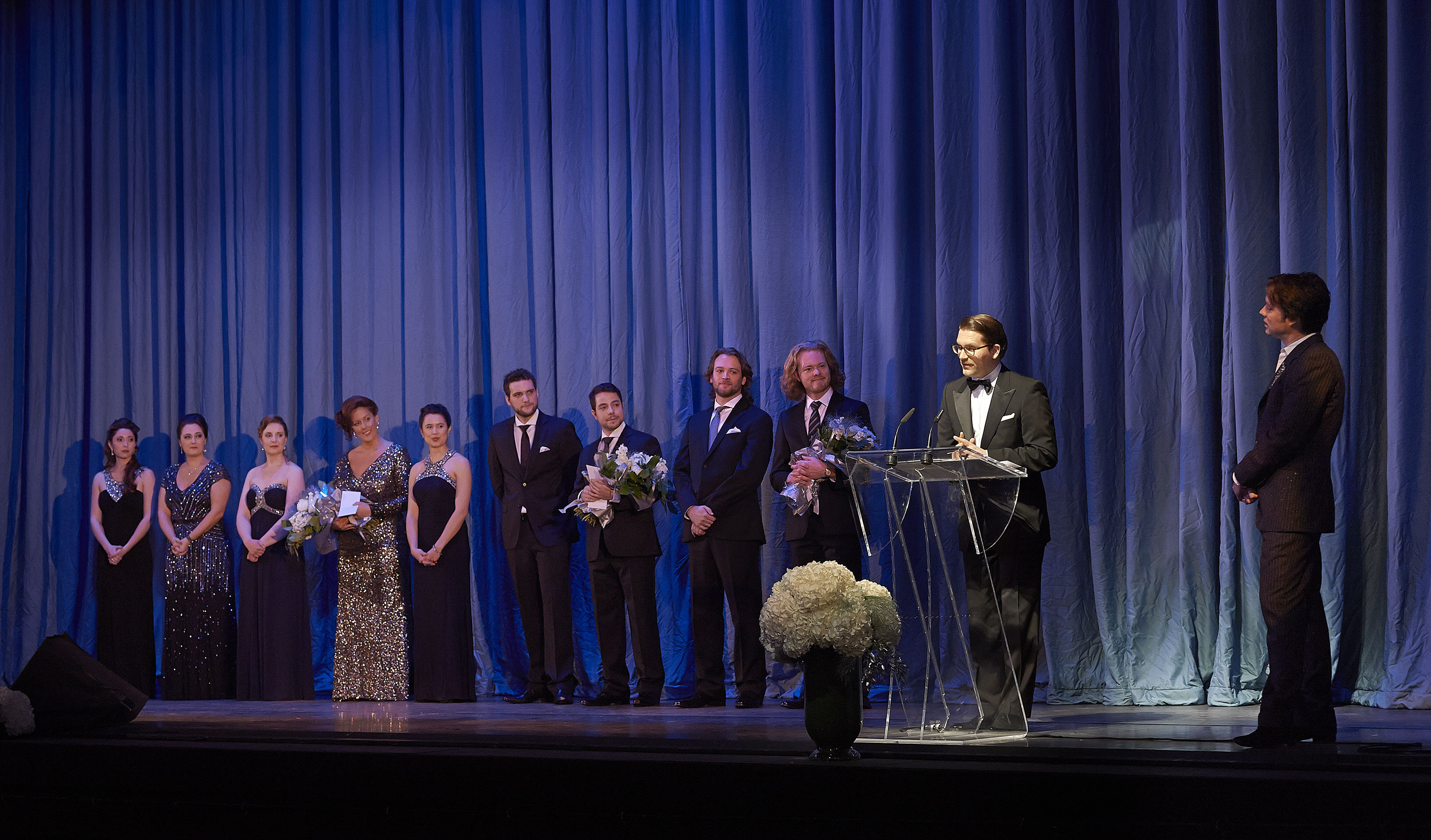 - Ensemble Studio Competition finalists and winners with COC General Director Alexander Neef (at podium) and Centre Stage host Rufus Wainwright | Photo: Michael Cooper