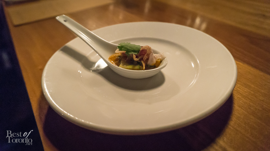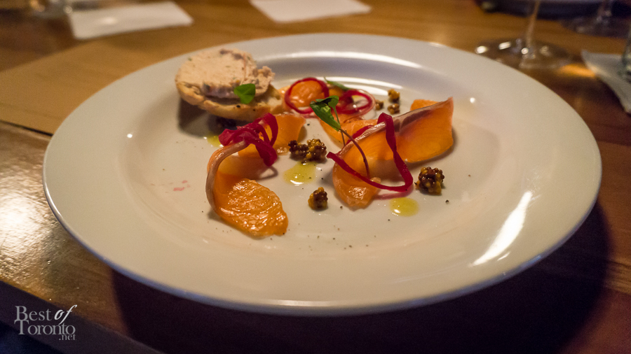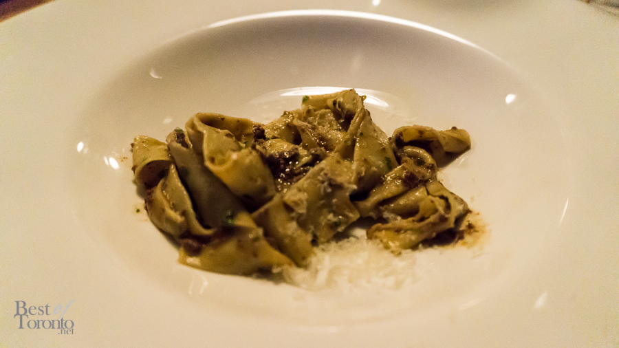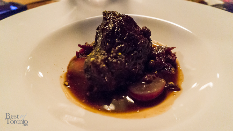 The Bone Marrow Toast was the next course. Normally any dish with bone marrow can feel very heavy, but it was thoughtfully paired with lighter ingredients (cucumber and radish) for balance. Next came the most traditional pub item we had that night – the Habits burger. The patty was very juicy, and it was topped with a Putanesca relish, crispy onions, and pancetta, all between a toasted brioche bun. The Chicken Liver Pappardelle was served next, and while I’m generally not a fan of liver, this one worked for me. The Braised Veal Cheek was the last of the mains and was my highlight. The veal was extremely tender, and had very strong flavours.