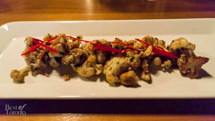 We sat down and were treated to the first course of the evening – the Seabass Ceviche. It was light and fresh, with just the right amount of tartness and sweetness. Then came the Buffalo Sweetbreads with its two dipping sauces. If having sweetbreads on the menu doesn’t tell you you’re in a gastropub, I don’t know what will. Next was the Salmon Duo – a salmon mousse on a crostini, and cured slices with pickles and mustard. Finally, there was the Roasted Cauliflower Salad, which was my favourite among the appetizers. This dish tickled multiple senses – with its crunchy and soft juxtaposition of textures, and its sweet, sour and spicy flavour profiles.
