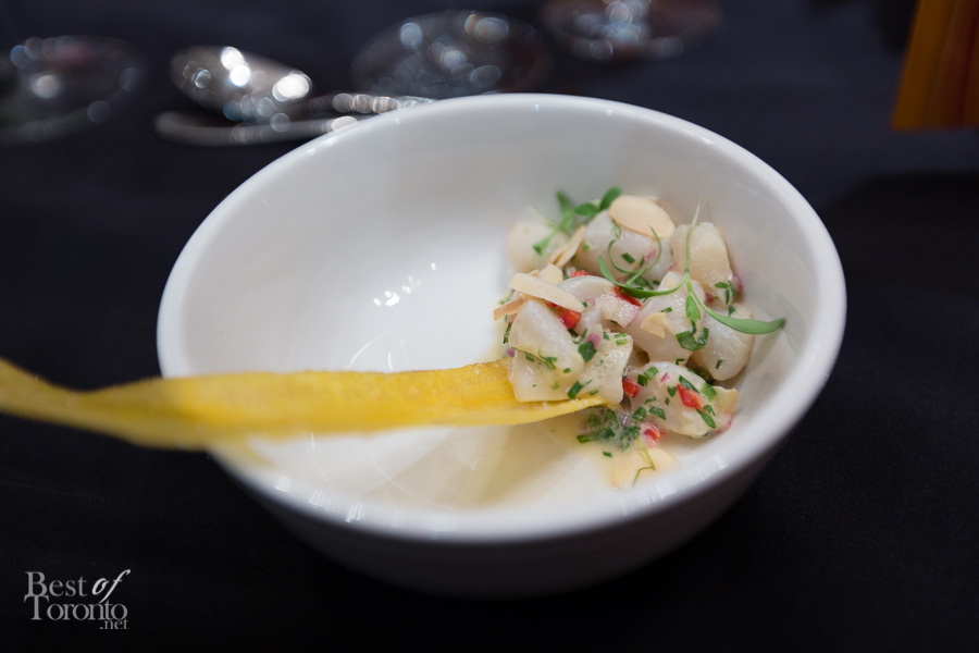 - Scallop ceviche, coriander cress, toasted almonds paired with Veuve Clicquot Brut Vintage 2004 – my favourite pairing