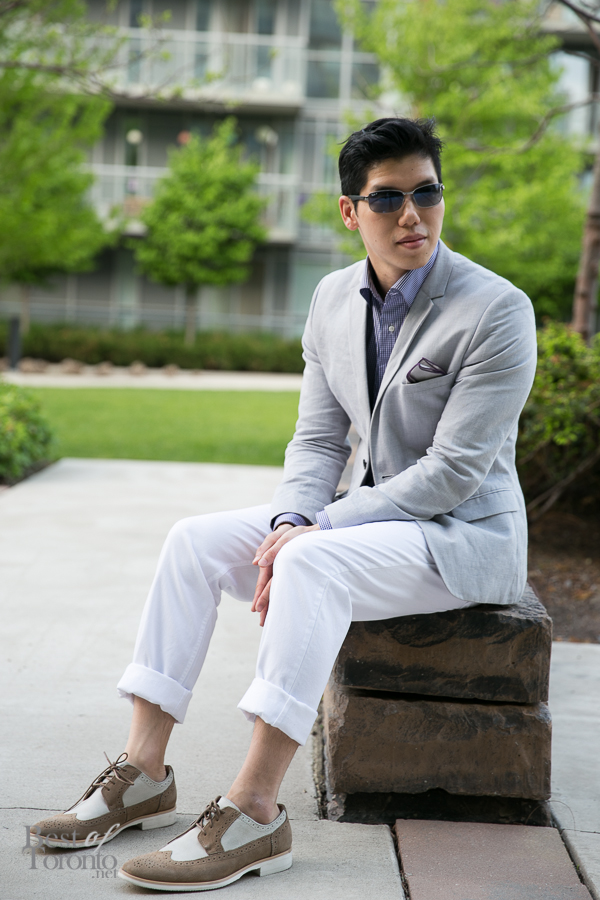 Custom dress shirt courtesy of Isaac Ely Bespoke based in Toronto, pants and linen blazer from H&M, Indochino pocket square, RayBan sunglasses and Stacy Adams oxford shoes from ShoeMe.ca