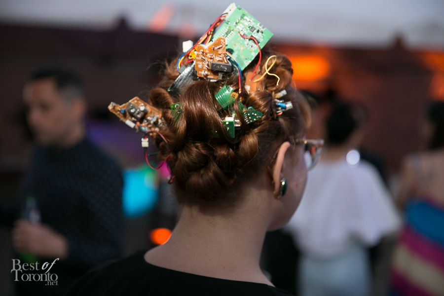 This year’s theme “Old/New World” celebrates the transition between the analogue world and the digital world we live in today. The main area exuded this old world/new world theme with CONFETTISYSTEM’s installation of hanging golden tinsels evoking the 1970s, but cut in very modern sharp right angles. The attendees also embraced this theme wholeheartedly with the fashion on display that night. Some chose to go very futuristic, going with interesting silhouettes and shapes. Others dressed according to their favourite past decade, whether it be the roaring twenties, or the disco era seventies, or any other pre-digital era. A cool accessory for the women was a computer circuit board used as a hairpiece or jewellery.