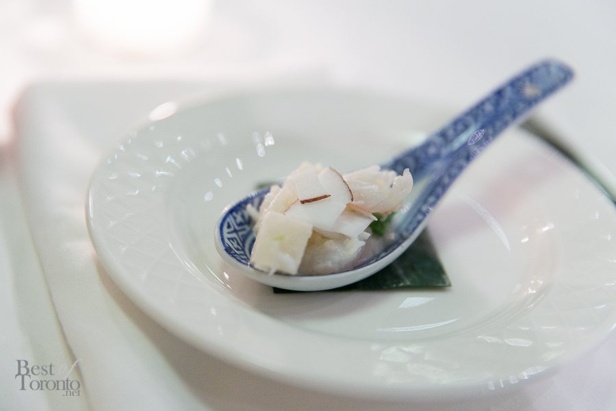 - “Ceviche Blanco” with shrimp, coconut, serrano, ginger
