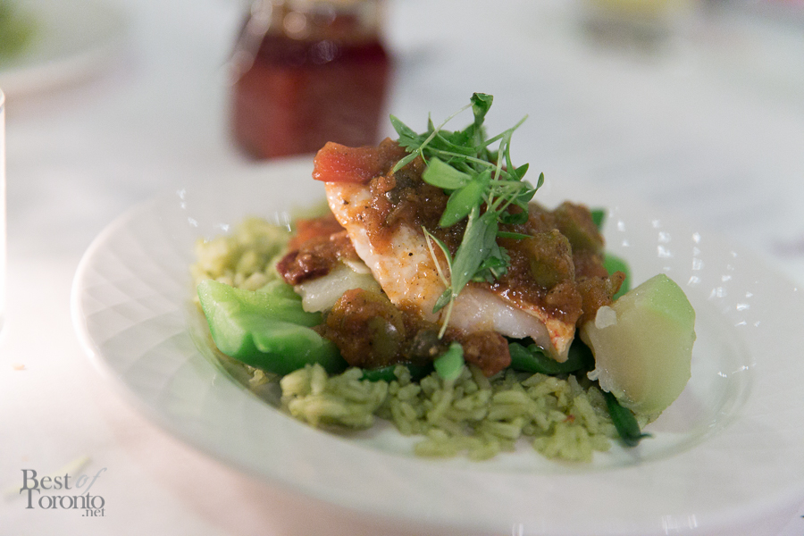 “Huachinango al a Veracruzana” with red snapper, seasonal vegetables, spicy Veracruz sauce, pablano rice