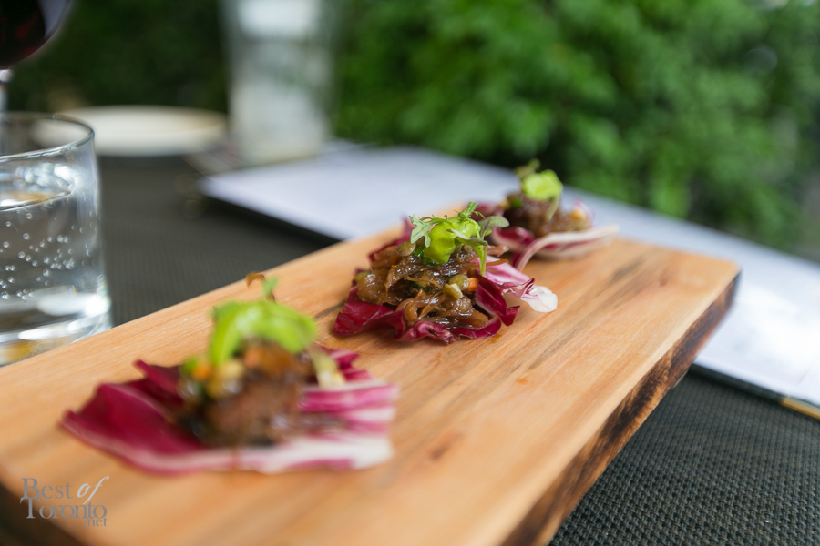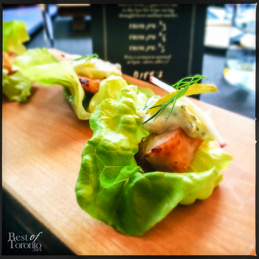 The fish dish was called “Cha ca la vong”, which was inspired by Chef Amanda Ray‘s travels to Vietnam. It is a lettuce wrap whose filling was a marinated catfish, topped with a yogurt sauce, herbs and some sliced pickled vegetables.