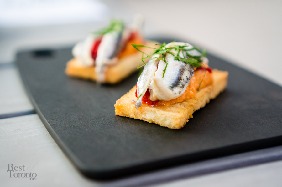 Marinated White Anchovy on Crostini, Piquillo Pepper, Romesco