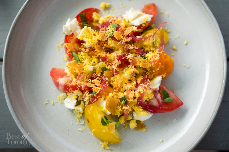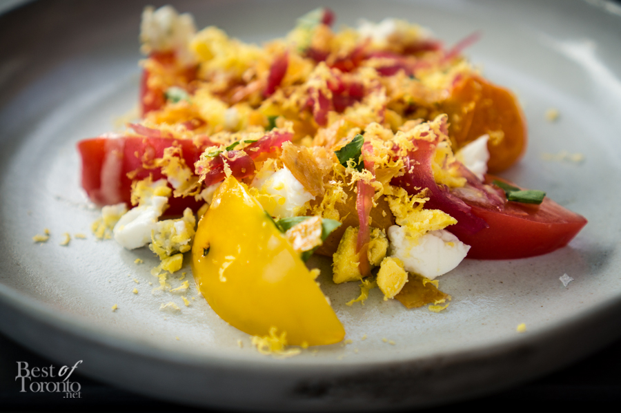 Heirloom Tomato Salad – Cured Egg, Pickled Onion, Chicken Crackling, Basil