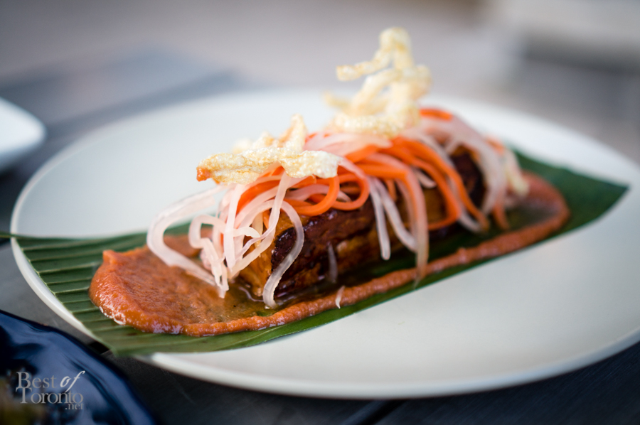 Chef Robbie Hojilla‘s Filipino roots were evident in many of the courses thus far, but none more so than in the 7Up and annatto glazed pork belly. With chicharron, atchara (sliced pickled vegetables), and banana ketchup, you can’t get any more Filipino than that. It was even served on a banana leaf. The pork belly was tender, and the contrast between the sweetness of the pork belly, and the tartness of the atchara and ketchup worked very nicely.