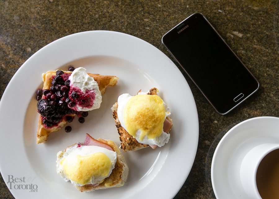 - Eggs benedict, waffle with toppings, coffee and a Samsung Galaxy S5