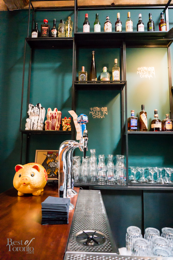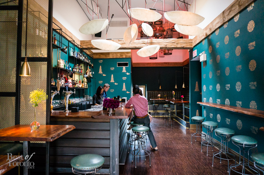 Upon arrival, we were led to the second floor to DaiLo’s companion bar LoPan. The first thing you notice is the striking décor. It’s definitely Asian-themed, but with a western twist. The wallpaper is green with gold-leaf pattern that cheekily includes the words, “Made in China.” You look up and you see light fixtures made up of bun-shaped shades above the bar and metal bird cages in another section. Behind the bar are black metal shelves that house the collection of liquor and lucky cat tchotchkes. The space definitely gives you that Chinatown feel, but with a French-style refinement. Ian Rydberg, of Solid Design, worked with the DaiLo team to conceive this space.