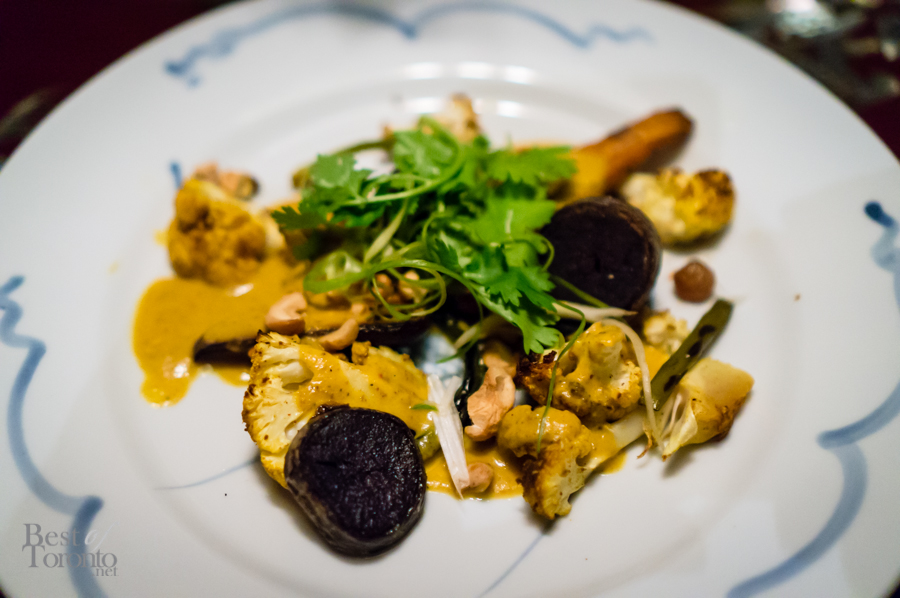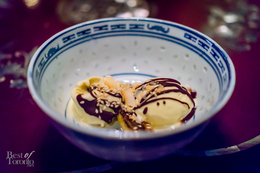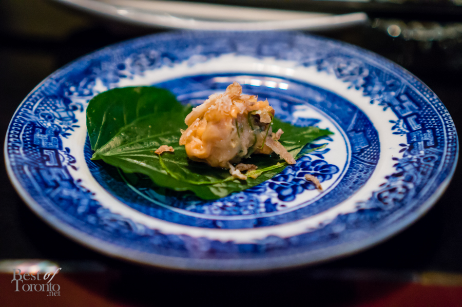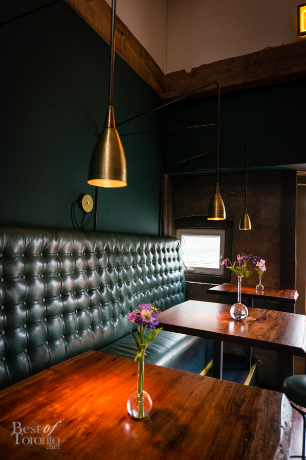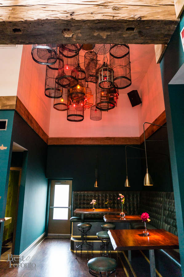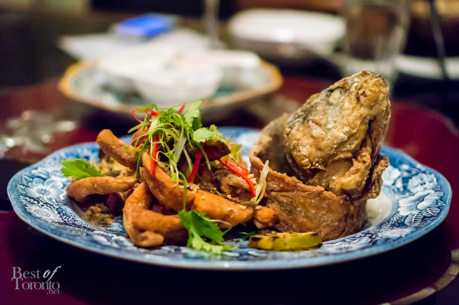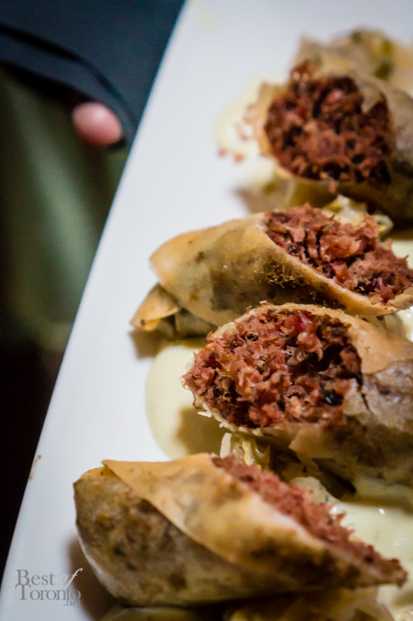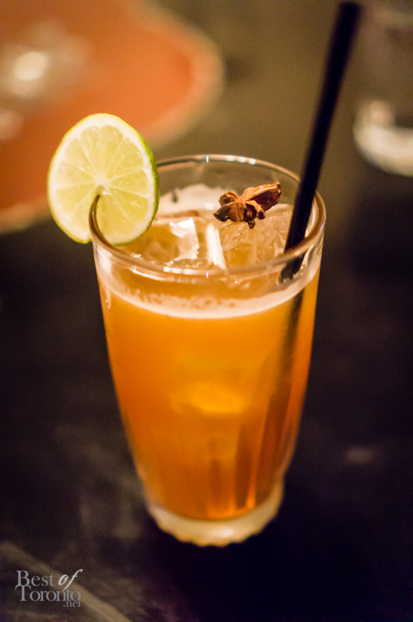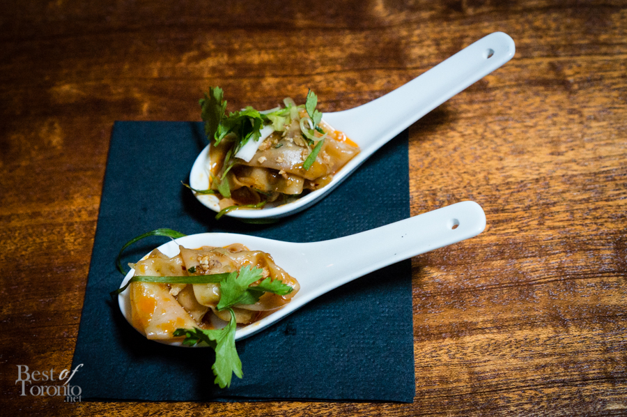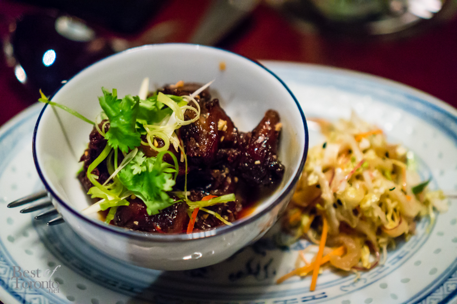 Where at other restaurants, you might need to go elsewhere to wait for your table, at DaiLo, you can simply go upstairs. LoPan is meant to be casual, serving drinks and bar snacks until closing. We sampled one of the signature drinks, the Tom Yum Booze – a play on Tom Yum soup. As for food, the snacks are dim sum style. The first was pastrami spring rolls, filled with smoked meat from Caplansky’s Deli just down the street. The second is Liu’s famous Big Mac bao, which is a steamed bao with a meat and vegetable filling slathered with Big Mac sauce. Obviously, these are not your ordinary dim sum dishes. Both were delicious, but my favourite was the Hakka pork and shrimp dumplings with chili sauce, which is a more authentic Asian dish. I could have eaten these all night long.