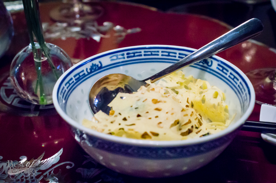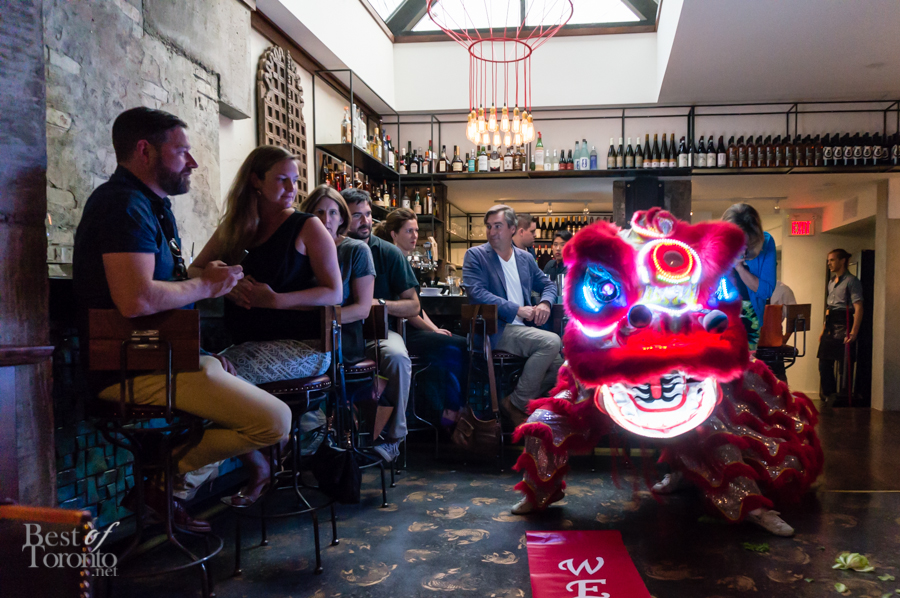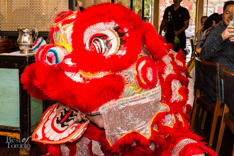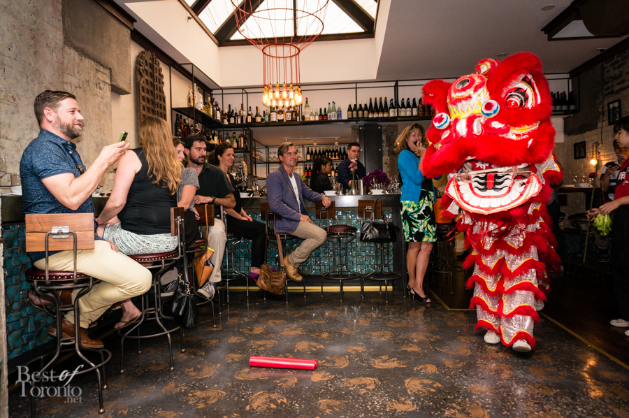 When dinner was ready, we were ushered back to DaiLo’s main space on the first floor. The Asian-theme was continued with the murals on the wall, the dragon pearl light fixtures, intricate screen dividers, and jade-like ceramic tiles. The light fixture at our table was actually a wok, which was a very cool and quirky touch. Dinner began with a bang with a lion dance, which is traditionally performed to bring luck and fortune to a new business.
