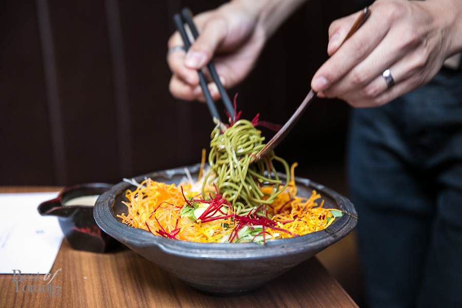 - Kinoko salad soba noodle, mushroom, ponzu dressing. An array of crispy textures mixed with the soba noodles.