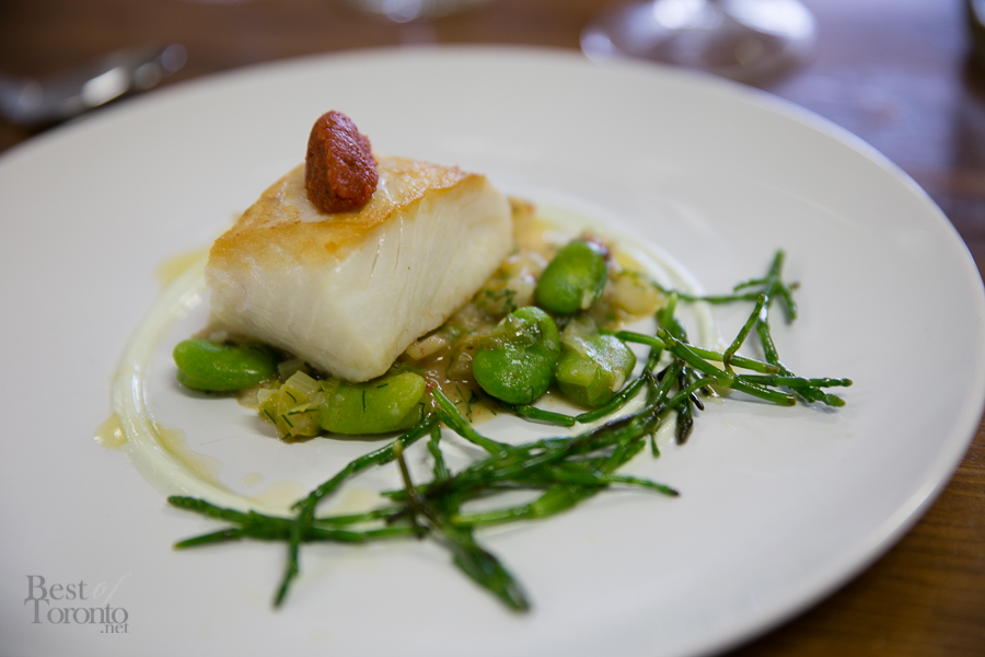The second dish was prepared by Chef Mackay. The flaky, golden -crusted halibut wore a perky quenelle of whipped sun-dried tomatoes. It sat on a lush bed of hearty fava beans, blistered tomatoes, and potato nuggets. Sea asparagus branches traversed the remaining territory of the pearly plate. They were slightly bitter, delicately salty, and just plain fun to devour.