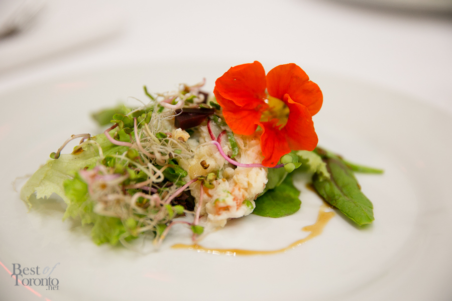 Some of the dish highlights included a buttery, raw sockeye salmon conceived by Chef Dammann. With its gorgeous coral hue, the sashimi- style fish was topped with translucent tomato gelee, and salty spheres of roe. Finished with some sweet basil and peppery tomato coins, the first course was a textured wonderland of tastes.