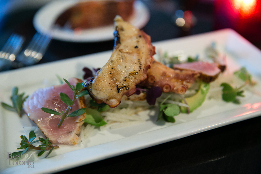 - Japanese style octopus yakatori w. Seared tuna, avocado,cilantro, jicama, sesame at Bijou Restaurant