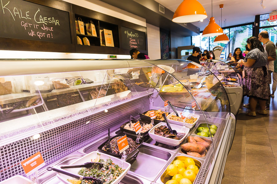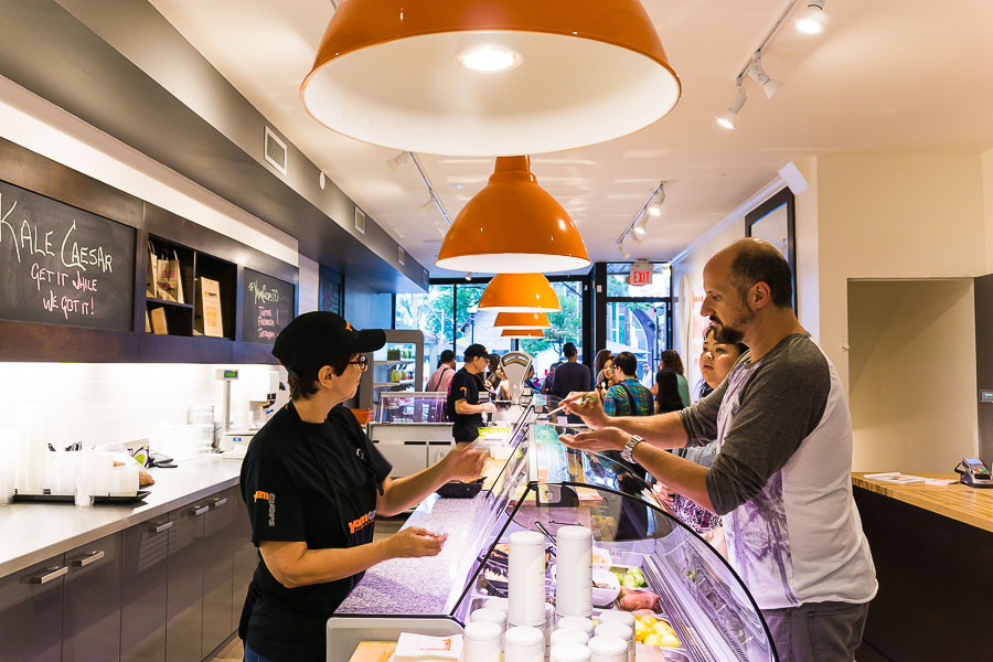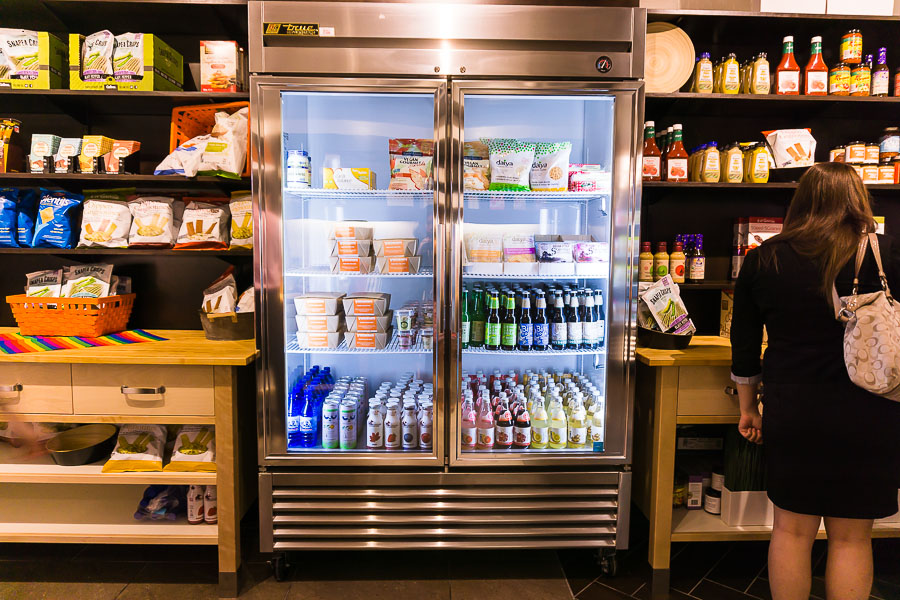 The delightful modern interior of the shop offers seating at the front of the store with stand-up tables, and an outdoor patio for guests who want to enjoy their boxed lunches in the warm weather.