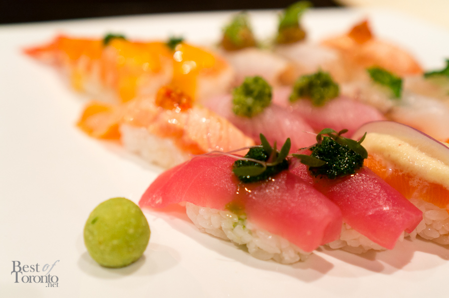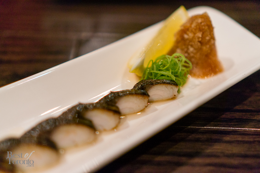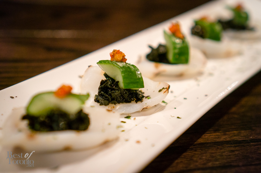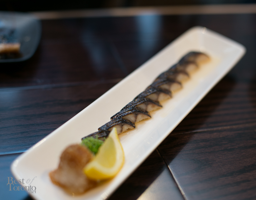 With all the great tapas, the highlights of the night though were definitely the seafood. The torched mackerel sashimi was delicious and expertly prepared and presented, especially considering how difficult it is to debone this particular fish. The sashimi sets included a variety of different fish. The pieces were of a good size and extremely fresh. The sushi set had a variety of unique garnishes, including garlic black olive, arugula pesto, and jalapeño. Each piece was great just on its own, and should be tasted without wasabi or soy sauce to really appreciate the flavours. Finally, there was grilled ika (ie. squid) which was also delicious. Note, this item is not on the menu as it was the special of the week. Chef Kevin Hyunki creates new items weekly, based on the seasonality and the freshness of available ingredients, thus upholding Japanese culinary traditions.