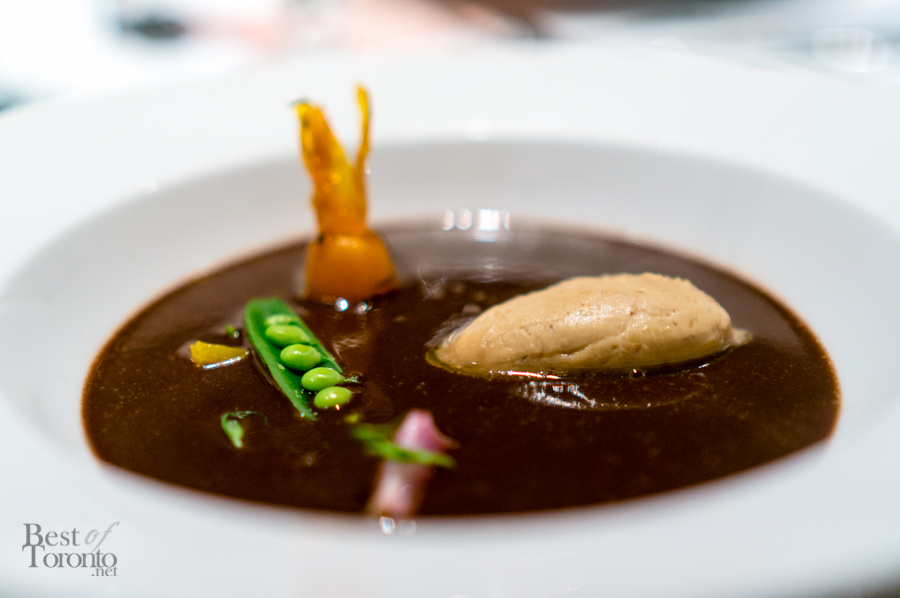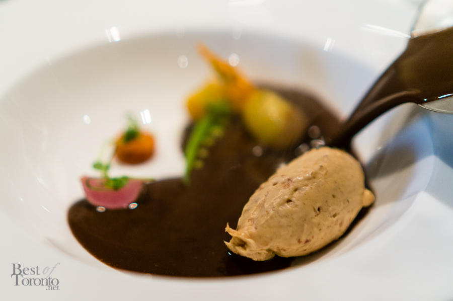 The first course was a spiced chocolate soup with foie gras and baby vegetables. The presentation was delicate and impressive – the foie gras and colourful vegetables stood out in the white bowl, and were then subsequently drowned in a sea of chocolate soup poured by our server. The flavour of the soup was very intense. It was a mix of salty, sweet, and spicy all at once. I ate every last drop.