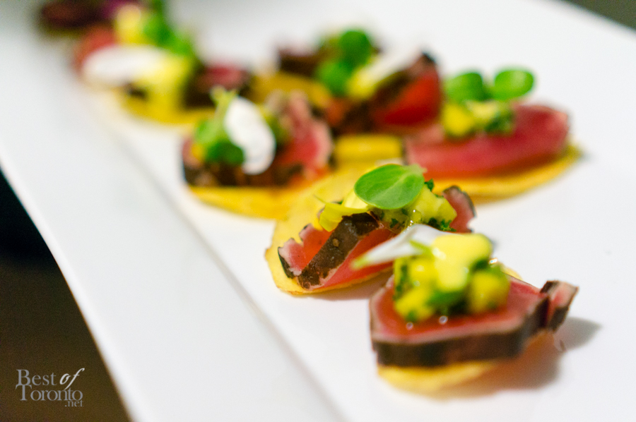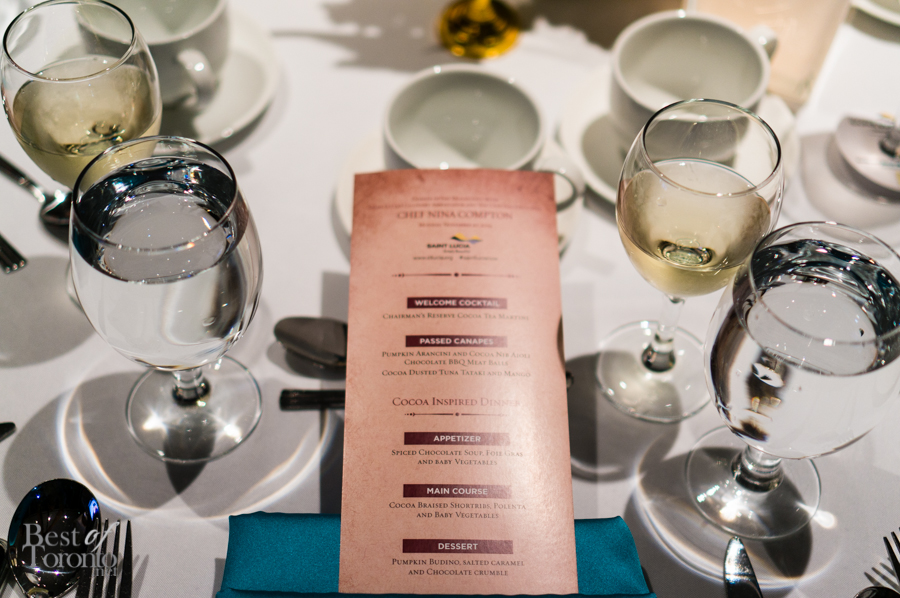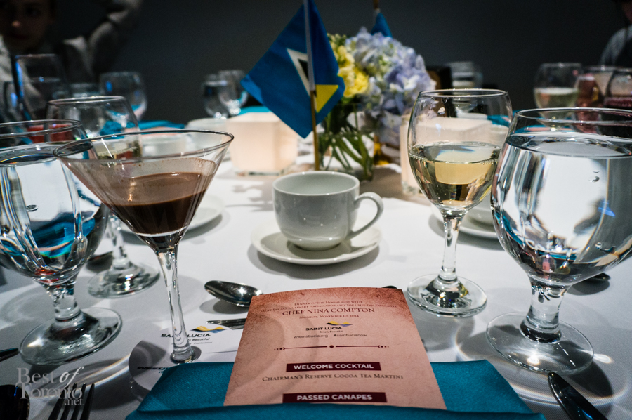 The evening began with some canapés. The cocoa dusted tuna tataki and mango came first. The slight bitterness of the cocoa and the brightness of the mango complemented the perfectly cooked tuna very well. The pumpkin arancini with cocoa nib aioli came next. It was light, crisp, and delicious. There was also chocolate BBQ meatballs, which unfortunately I missed. After these canapés, it should have been obvious to me that cocoa and chocolate would be recurring themes in the night’s menu. Cocoa from Saint Lucia is regarded as being very high quality, so it’s not surprising that this ingredient was featured.
