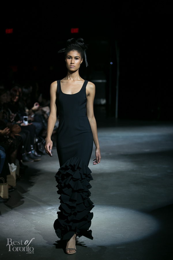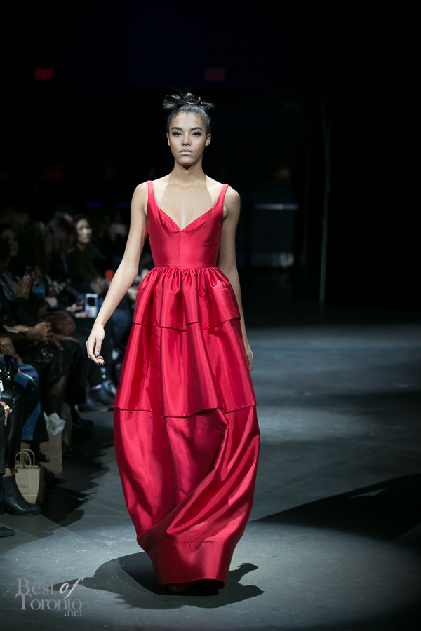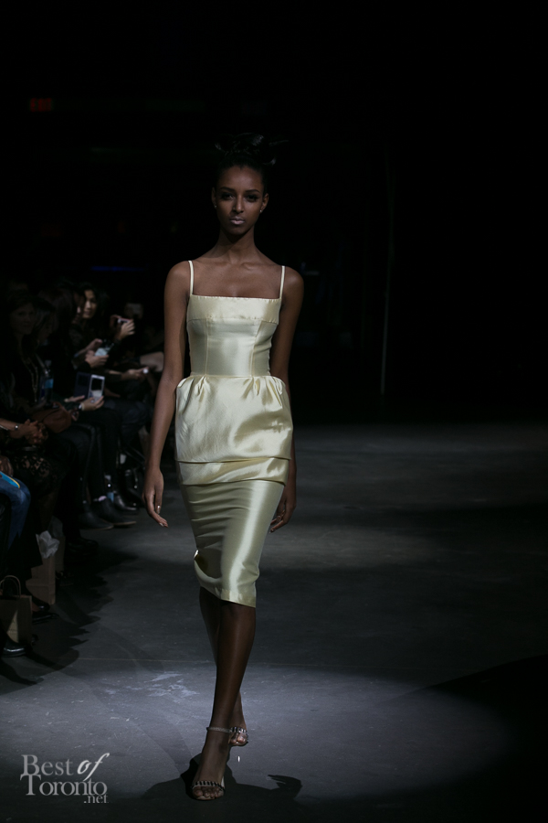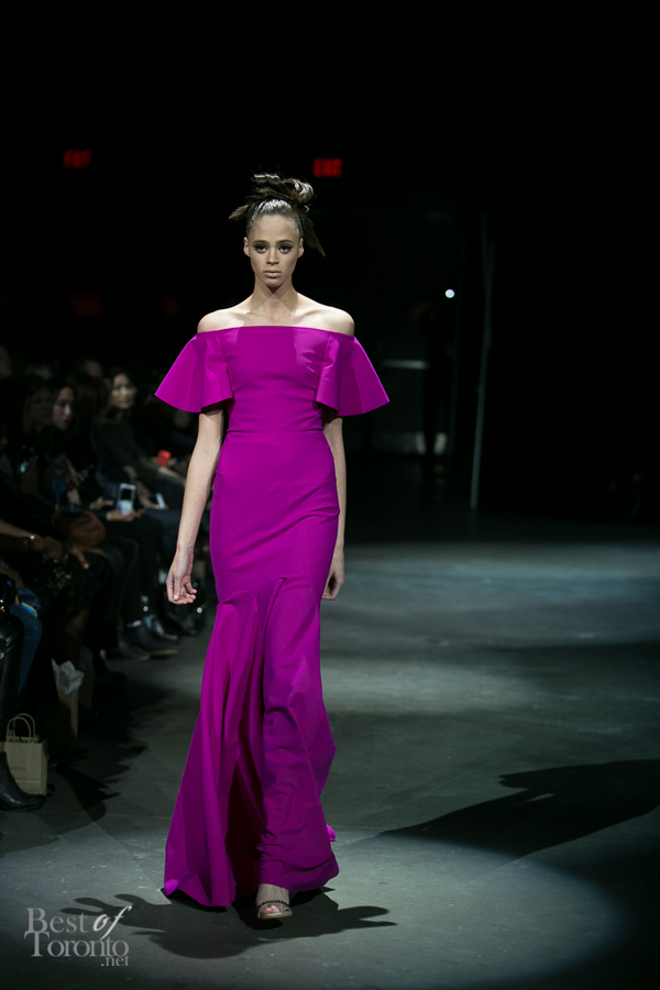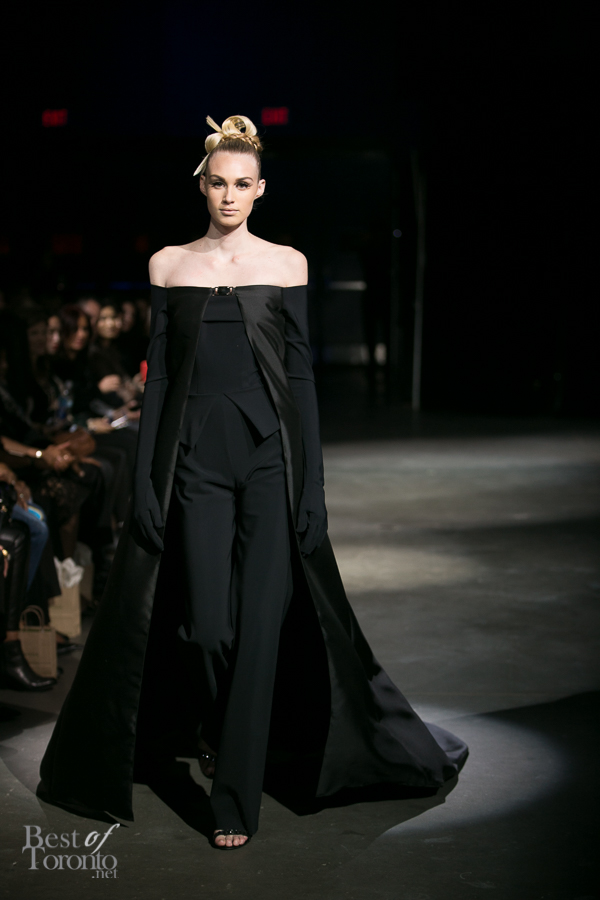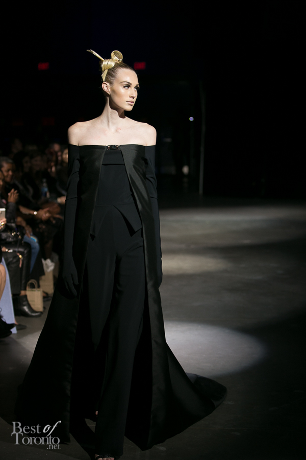 The show began with nude jersey dresses, the resort-ready must haves, and then quickly made its way into colourful gowns, dresses and cocktail party pieces. The standout piece was the black strapless cape that glided down the runway with gloves that seemed to go on forever.