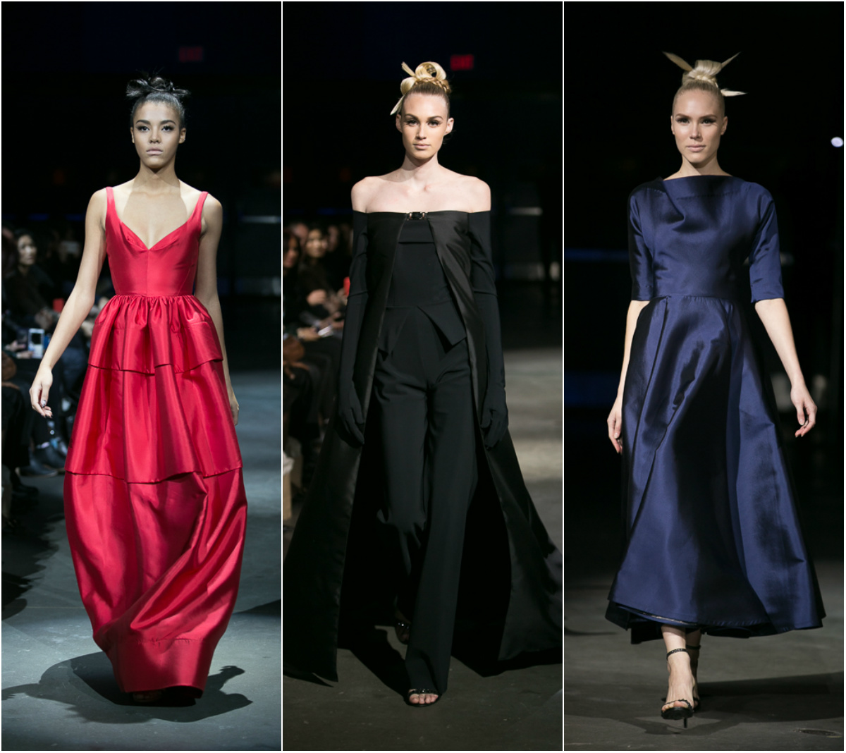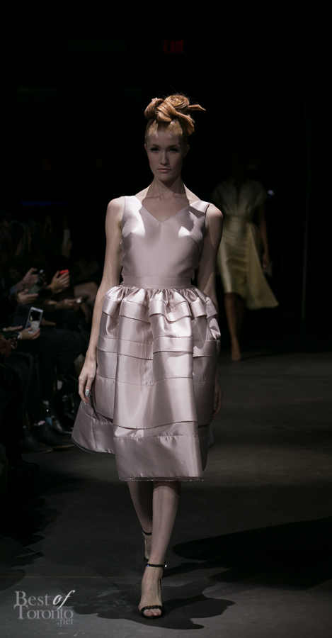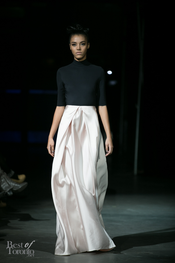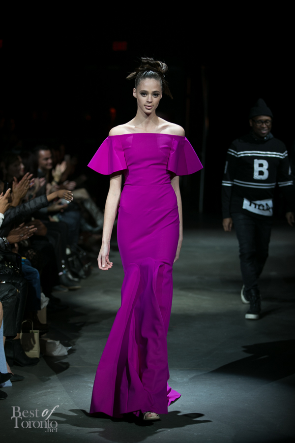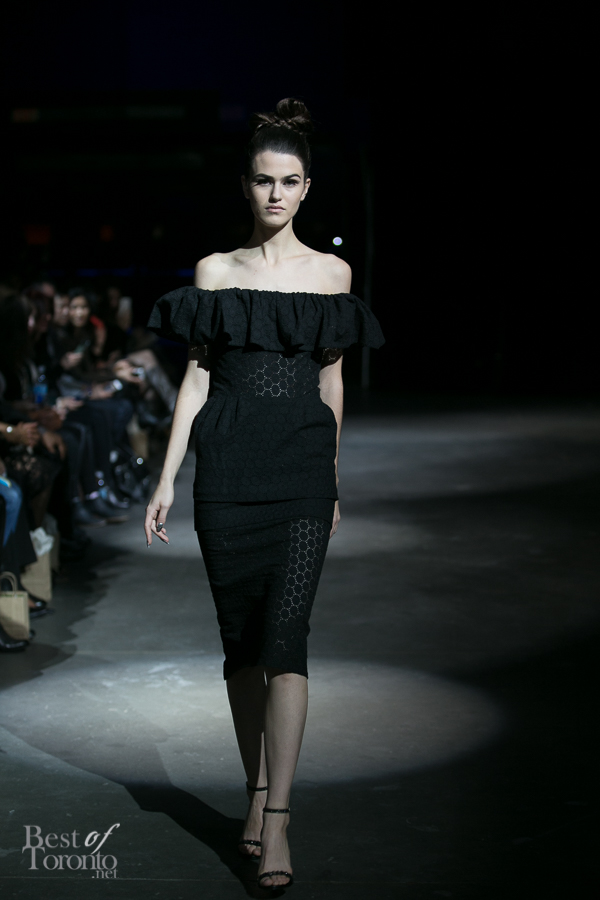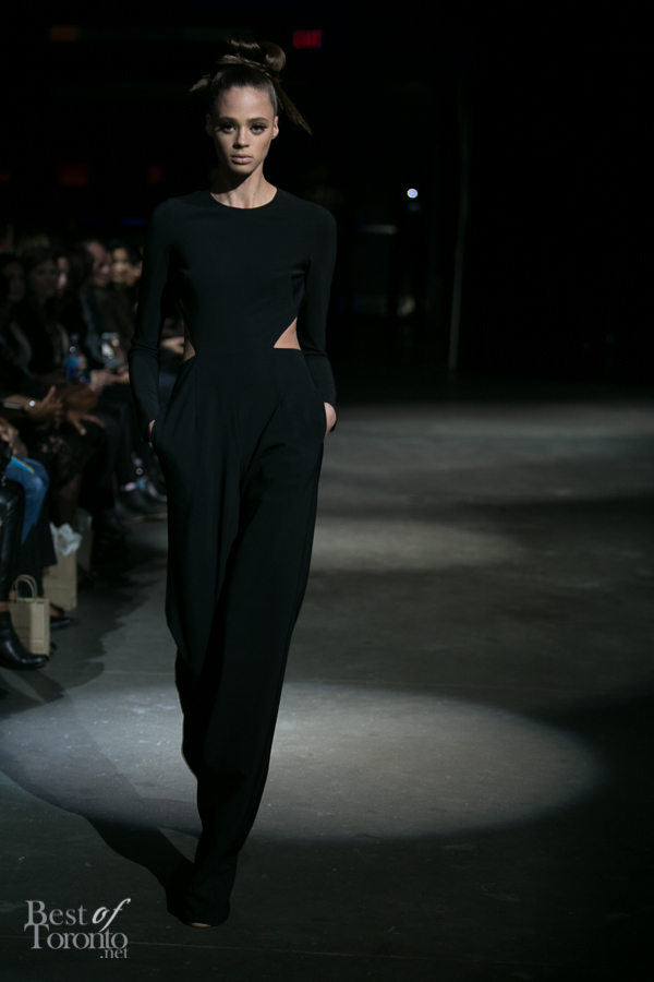 The show began with nude jersey dresses, the resort-ready must haves, and then quickly made its way into colourful gowns, dresses and cocktail party pieces. The standout piece was the black strapless cape that glided down the runway with gloves that seemed to go on forever.