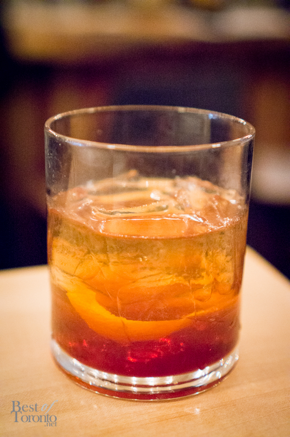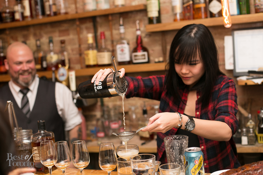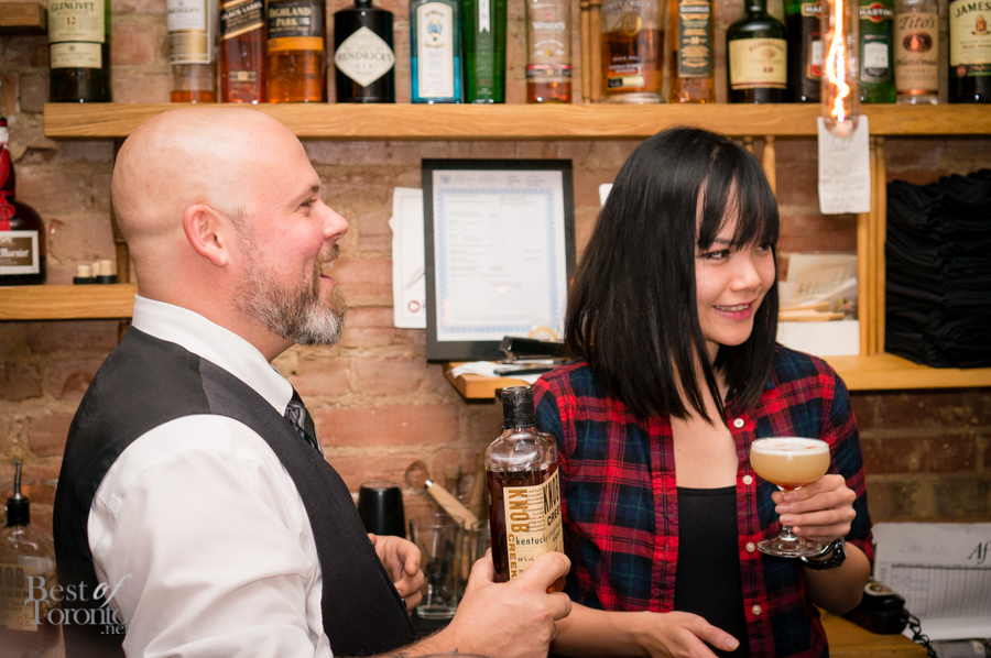 With the mains, we each had the opportunity to create our own cocktails using either the Devil’s Cut or the Knob Creek Straight Bourbon. I chose the latter as it was my favourite of the four bourbons we tasted earlier in the night. For the ingredients I chose, I was inspired by the flavours of a holiday confectionary – the chocolate orange. Along with the bourbon, my cocktail consisted of vanilla-infused simple syrup, sweet vermouth, orange and chocolate bitters, and chocolate garnish. Jones walked us through each step of making our cocktails, tasting and making adjustments along the way to ensure we had the cocktail we envisioned. This was a very cool, interactive, and personal component of the night.