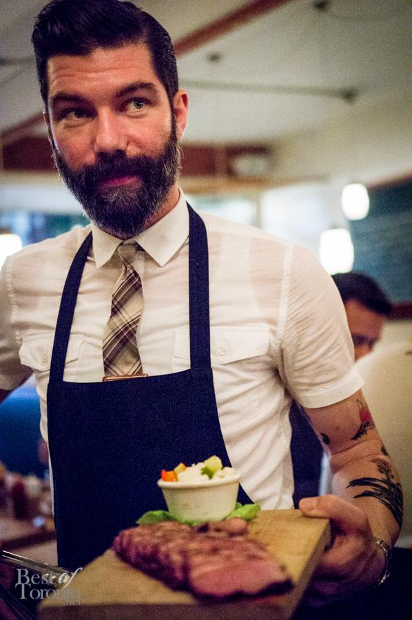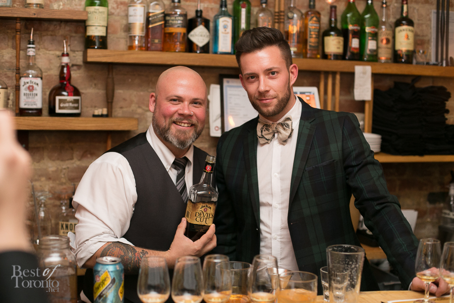 Matt Jones, whiskey ambassador for Beam Suntory Canada, then led us in the tasting of four different bourbons (top image) – the Basil Hayden, the Devil’s Cut, the Knob Creek Straight Bourbon, and the Knob Creek Single Barrel. He briefly explained the process of making bourbon and provided some interesting facts along the way. For instance, did you know that 95% of the world’s bourbon is made in Kentucky? Of the four bourbons, the Devil’s Cut had the most interesting story behind its name. As the bourbon ages in its barrel, part of it is lost due to evaporation. This lost liquid is called the “angel’s share”. When the barrel is emptied, some whiskey is left trapped in the wood of the barrel, and this is the “devil’s cut”. This whiskey as a result has a lot of flavours of wood, oak, and vanilla. The Jim Beam Devil’s Cut bourbon is made by extracting this liquid from the barrel wood and adding it back in to Jim Beam Black Label Bourbon.