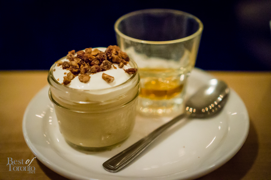 And finally came dessert – the vanilla-infused pudding topped with candied pecans. The texture of the pudding was silky smooth, in perfect contrast to the crunch of the pecans. It was a great dessert to end the night. It was paired with the Knob Creek Smoked Maple bourbon, which was also used in the dessert. The bold, smokey flavour of this bourbon worked very well with the sweetness of the pudding.