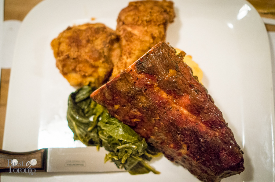 - Sous Vide Buttermilk Fried Chicken, Peach & Basil Hayden Mopped Baby Back Ribs, Cheddar Corn Bread, Collard Greens | Photo: John Tan