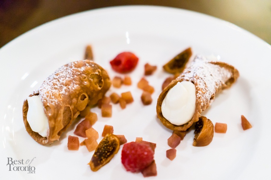 Having sampled six dishes thus far, we were full, but thankfully not overly full, as desserts were still to come. This to me says that our meal was quite well balanced, and not overloaded with heavy components. The first dessert that came was a traditional Sicilian cannoli. It’s not often I rave about a cannoli, but I really enjoyed this because of a shell that was perfectly crisp, and a filling that was silky smooth and with just the right amount of sweetness. The figs that accompanied the cannoli was a nice unexpected twist. A chocolate nest came next; this dish was absolutely stunning in its presentation. The nest was composed of hardened strands of chocolate, and it was topped with a rich, creamy chocolate mousse that was just firm enough in consistency to hold its shape.