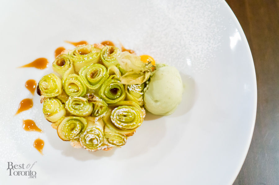 - Frangipane Apple Tarte – Frangipane Tarte with Apple Rosettes, Caramel, and Pistachio Gelato | Photo: John Tan