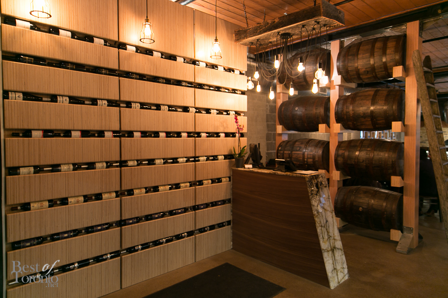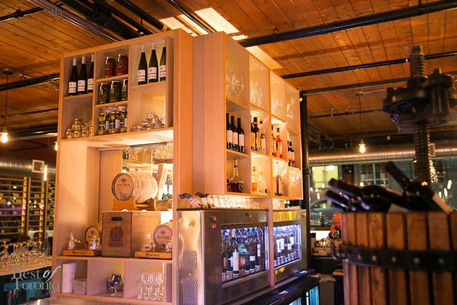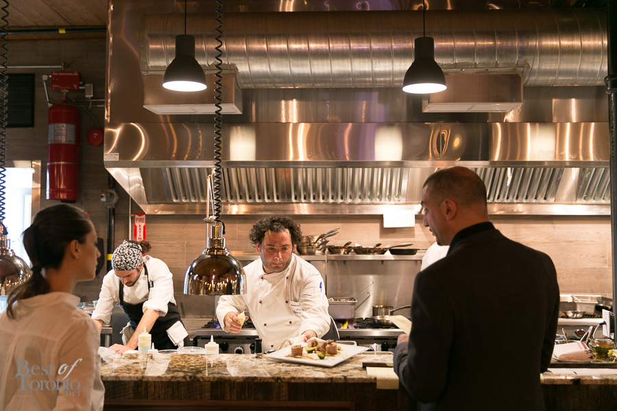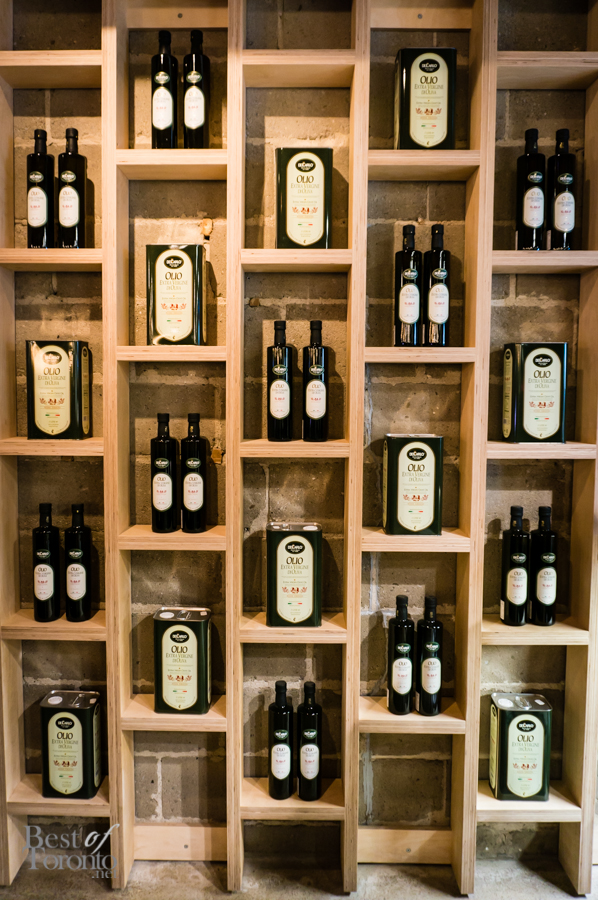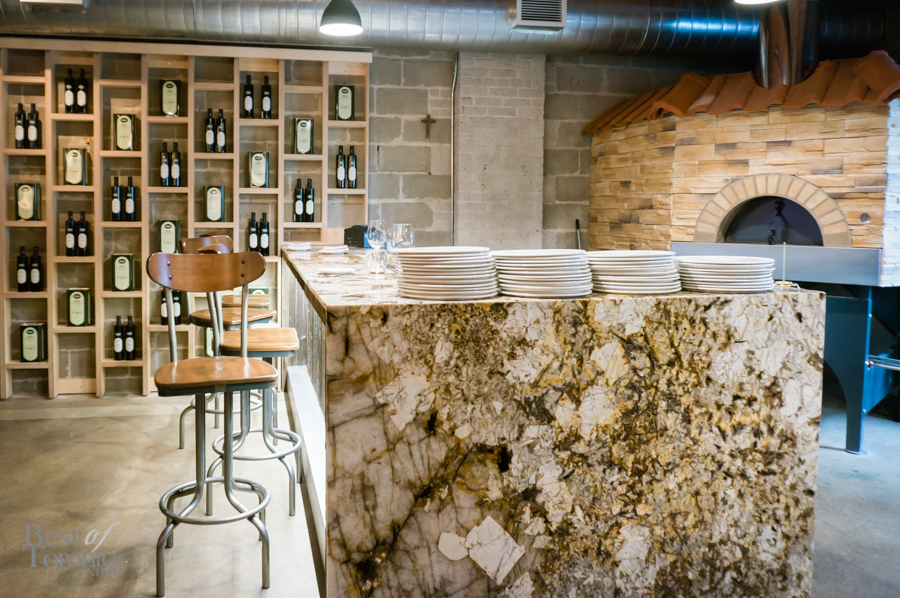 When you enter the restaurant, you immediately feel a sense of welcome. The light from the incandescent bulbs bouncing off the exposed ceilings and polished concrete floors gives the place a warm glow. The open kitchen is where you can observe Chef Luca and his team meticulously prepare their culinary creations. The walls are adorned with bottles of olive oil and wine. It’s a large space, and yet somehow it still manages to feel intimate.
