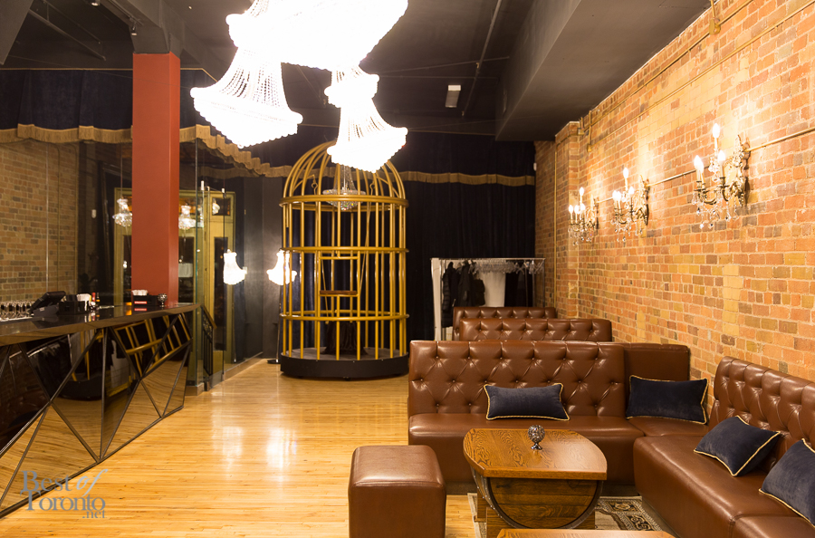 - 4,000 square feet of total space decked out in Swarovski crystals, velvet, gold to the backdrop of original exposed brick, beam work and gothic-inspired double arch windows.