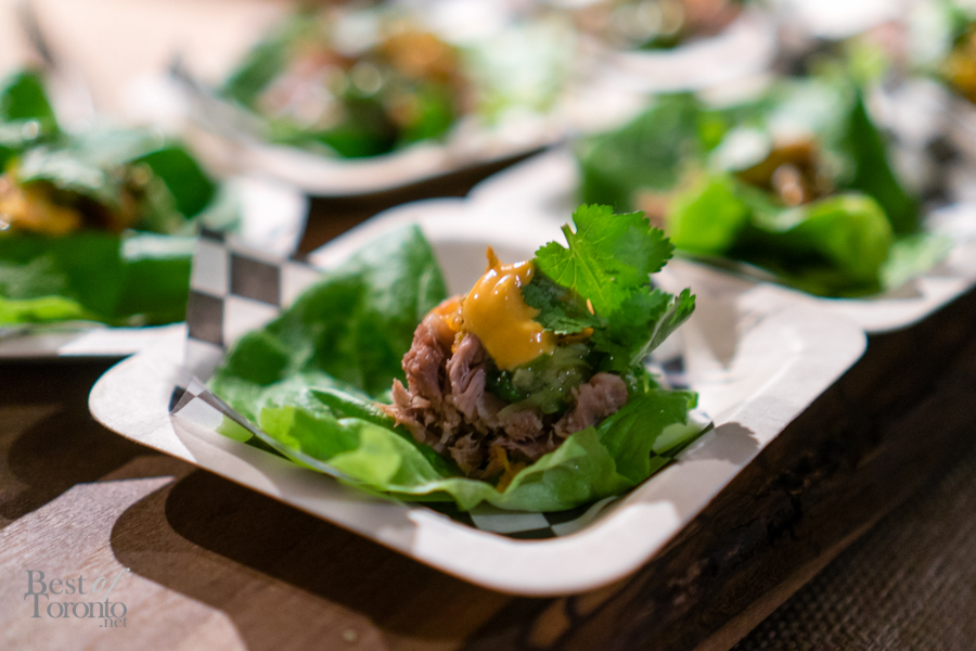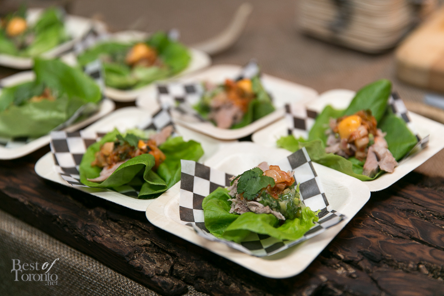 Along with the served bites, there were also two food stations. On one side, there was popcorn shrimp and grits. The grits were creamy and cheesy, complementing the heat of the crunchy-on-the-outside, tender-on-the-inside, popcorn shrimp. On the opposite side, there was the pork bo ssam with lettuce wraps. The slow-cooked pork was carved right at the station, placed carefully on a lettuce leaf, and topped with some kimchi, sweet mustard, and cilantro. Both dishes were hits among the guests.
