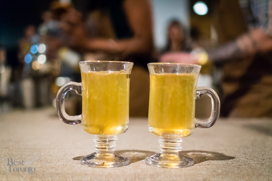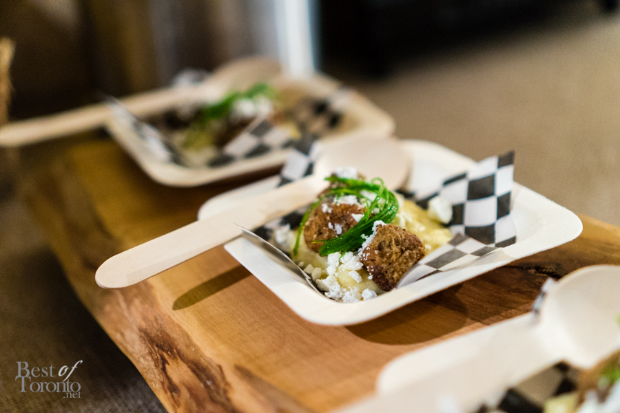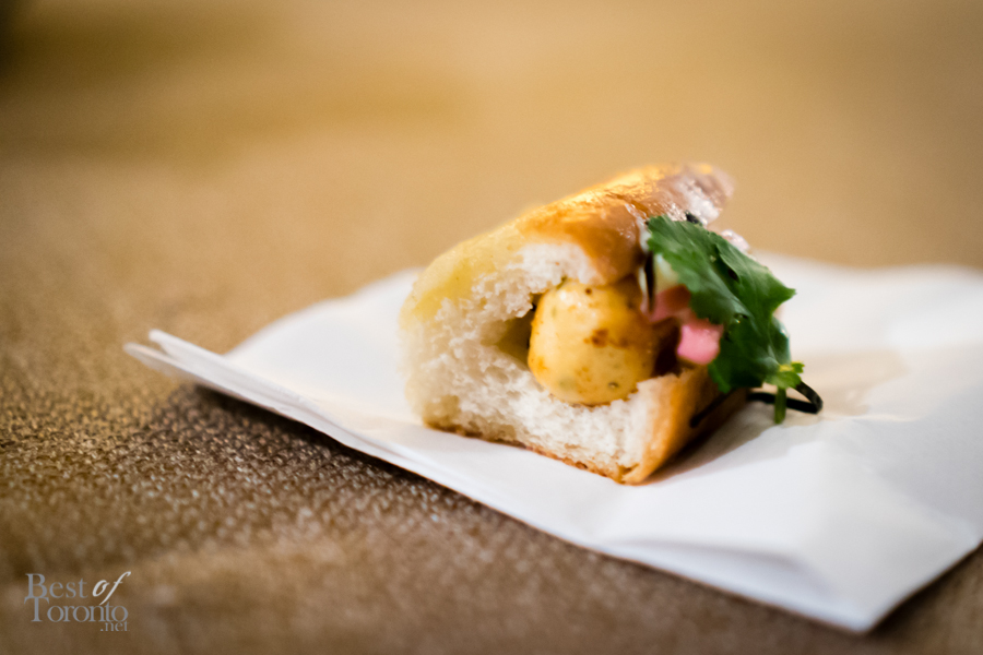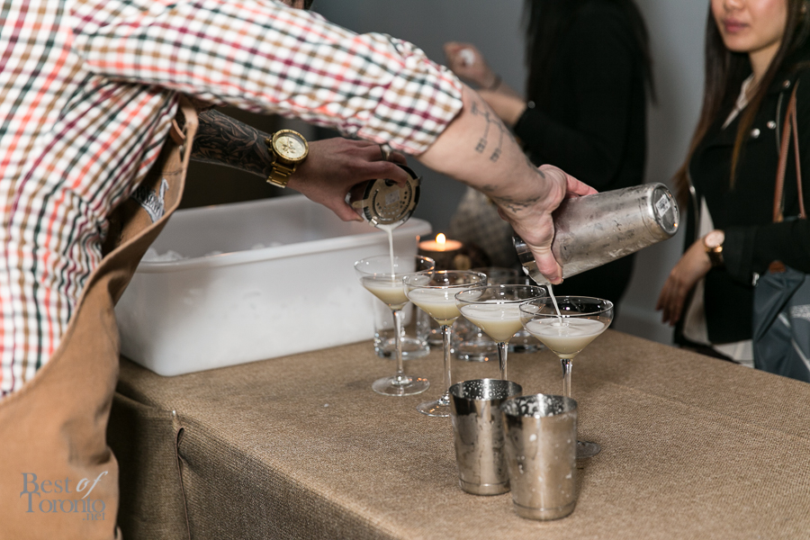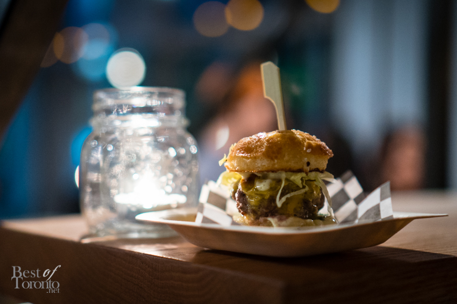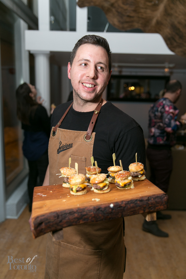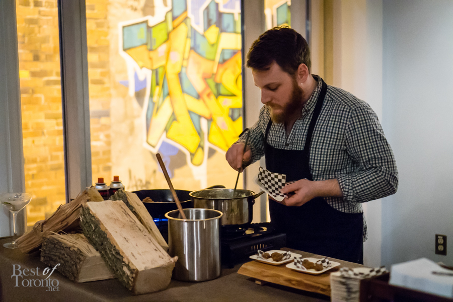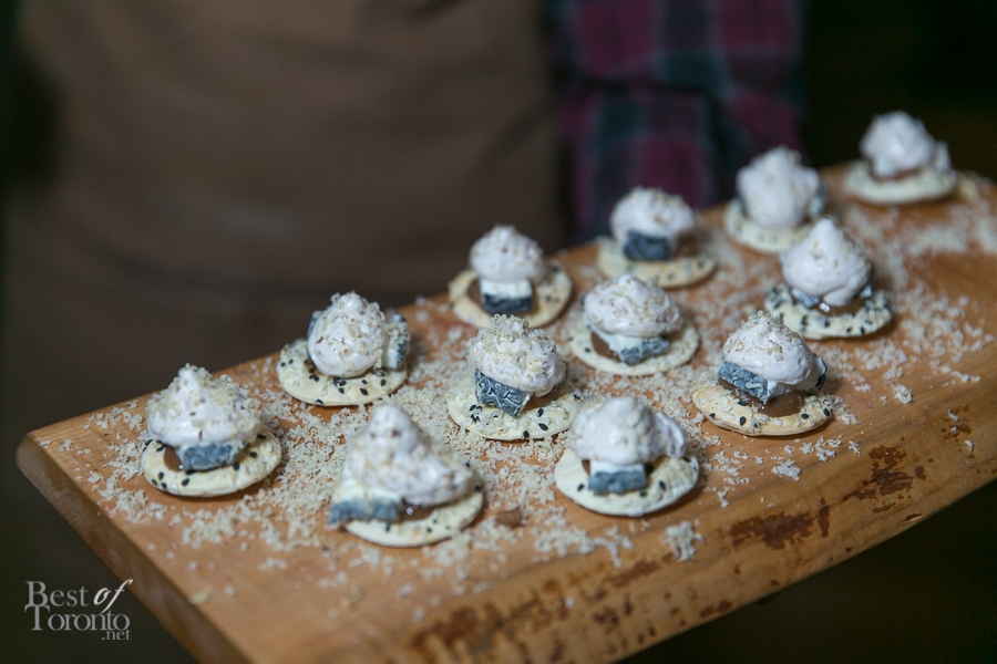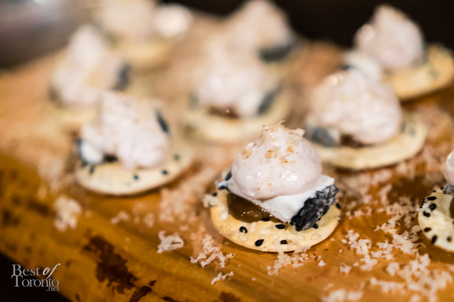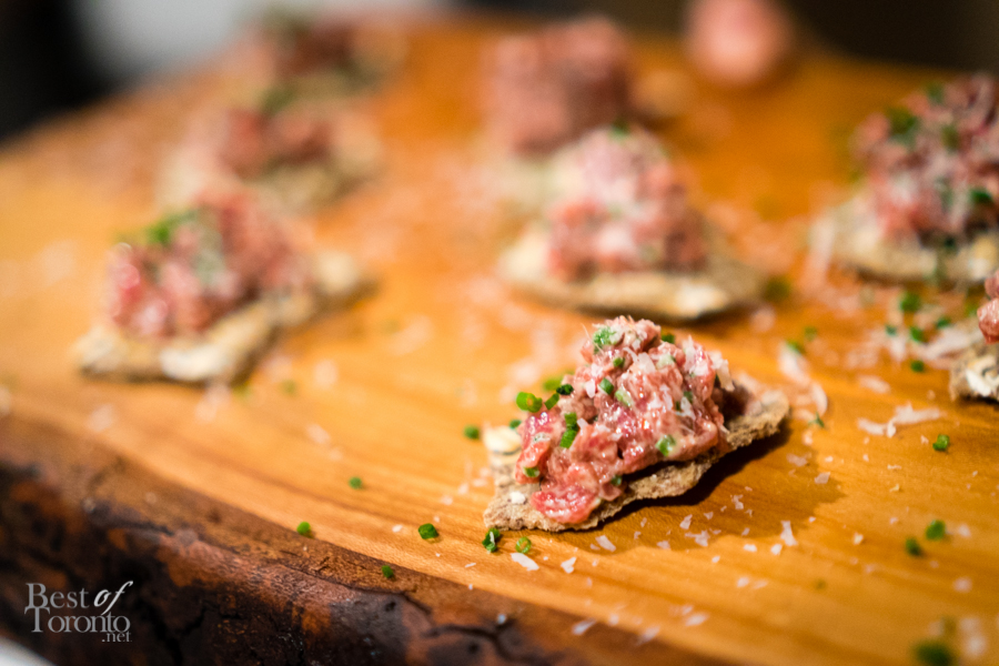 Throughout the night, passed snacks circulated the warm, inviting space created at The Richmond letting us, if but for an evening, forget about the winter still outside. Every item we tried was a hit, but there were two standouts for myself personally – the Ontario harvest brisket burger, and the Tokyo torched dog – both of which are foods typically associated with summer. The burger (top image) was absolutely delicious – the milk bun was buttery, the meat was tender and juicy and dressed with a great combination of toppings and condiments. I was surprised to hear the Tokyo torched dog is actually made from salmon and scallops, making for a dog that was flavourful and soft. The pickled red onion gave it a nice sour punch, balancing nicely with the kewpie mayo and cilantro. Other standouts included the grey owl goat’s cheese, and the 45 day dry aged raw beef – a tartare served on a multigrain raw cracker.