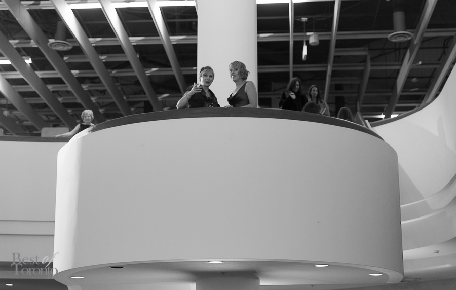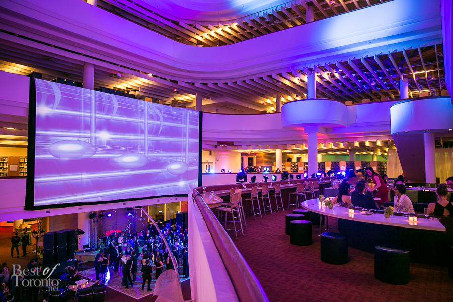 Held at the Toronto Reference Library designed by Moriyama & Teshima Architects, pink lights basked the massive five storey atrium adding a theatrical flair to the literary inspired event.