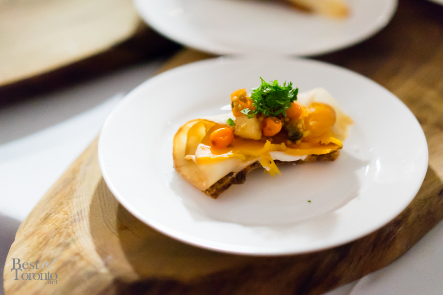 This year’s edition of this annual fundraising event is called Party for the Future of Food, and what a party it was. With so many dishes to sample, it was impossible to try them all, so it was great to chat with the friendly, enthusiastic guests who happily recommended their favourites. From the savoury side, my own favourites were the oysters from Hooked Inc, the beef and celery dumplings from Bernardin, and the buffalo chicken with chicharron in a black pepper biscuit from the Omni King Edward Hotel.