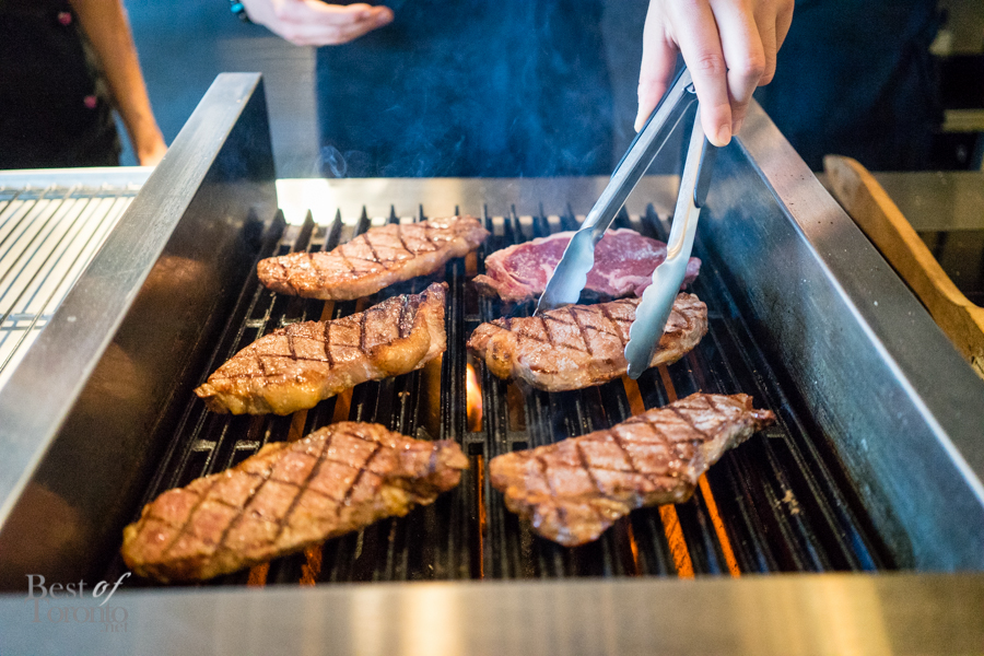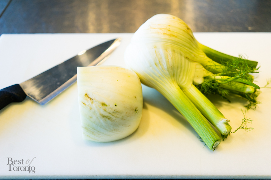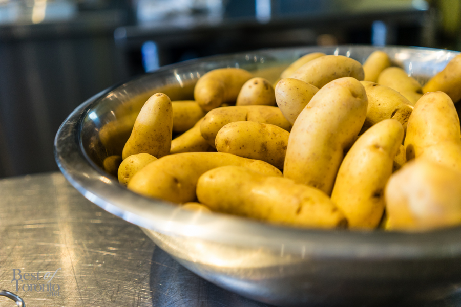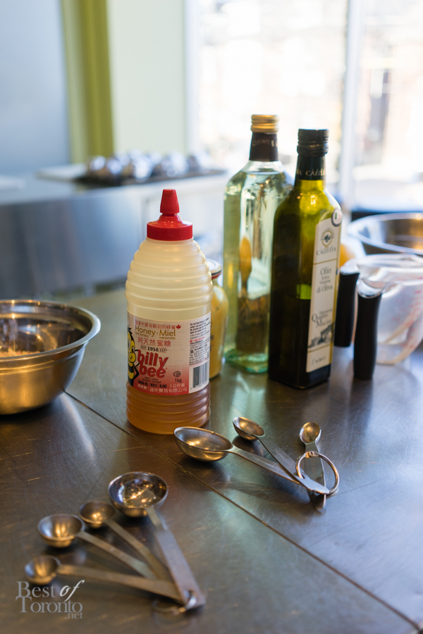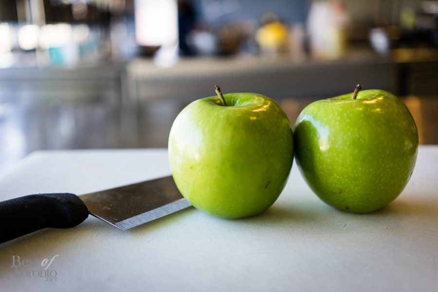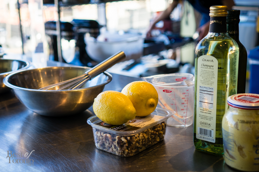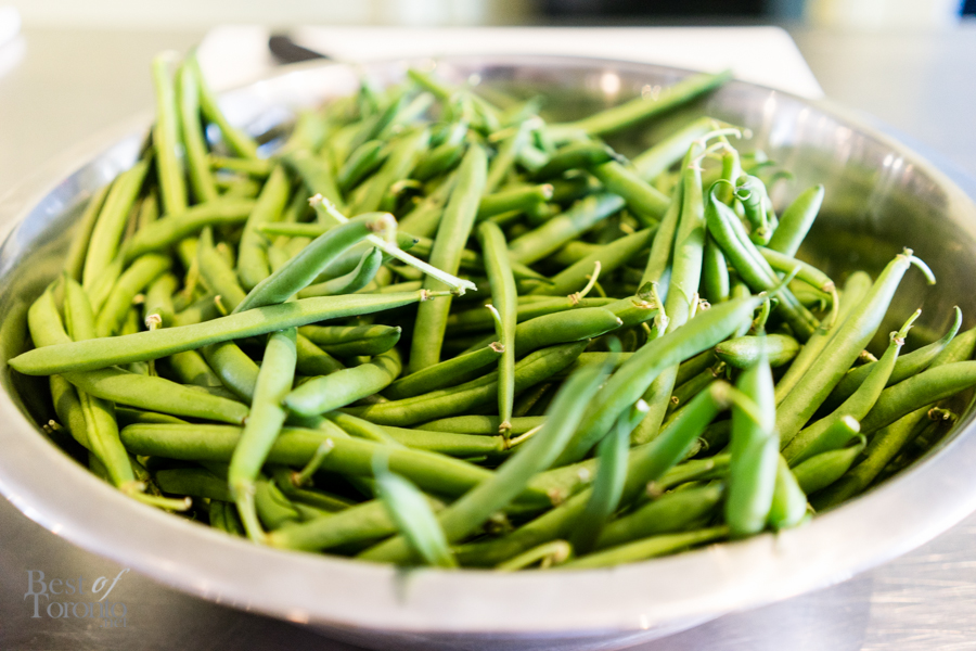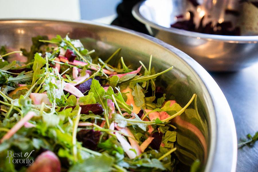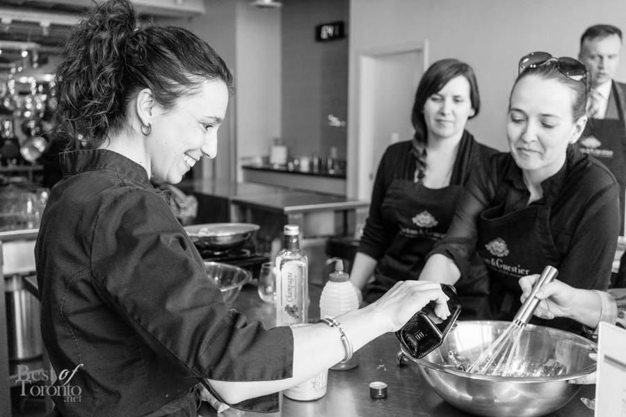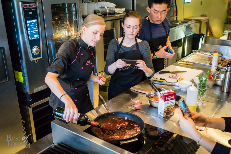 After some opening remarks from Quereux, it was time to cook! The attendees were divided into three groups handling the salad, the main, and the sides. The mains were New York striploins provided by Beretta Farms. I love to grill so I was very happy to be in the group handling these steaks. Nash taught us how to judge by touch the doneness of a steak using the fleshy part of our palms. You can also use a meat thermometer, and at 120 C the steak will be at medium rare. She also explained the importance of resting the steak after it’s been grilled; to do this properly, it should be placed on a rack uncovered so that it doesn’t continue to cook in the heat it’s releasing. I can’t wait till the summer grilling season to put this knowledge to good use. We then made the jus for the steak using a bottle of B & G Partager La Gardie Cabernet Sauvignon, shallots, butter, and a fresh sprig of rosemary.
