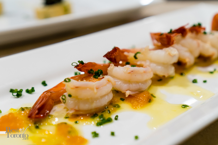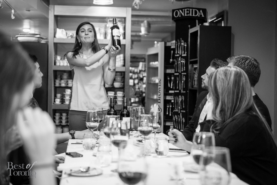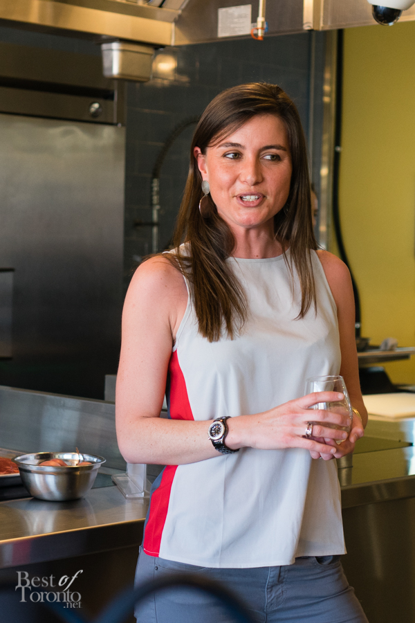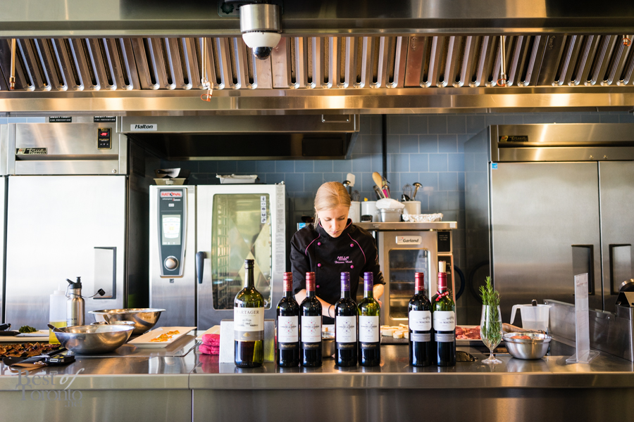 When we arrived on the second floor of Nella Cucina where the cooking school resides, we saw Chef Brianne Nash and her team hard at work preparing hors d’oeuvres. Nash was a Chopped Canada winner in its first season, and also won the Discovered Chef competition at Nella Cucina in 2012. The first glass of wine we would try is the B & G Passporte Bordeaux Blanc, which derives from the Sauvignon Blanc and Semillon grape varieties. This one was crisp and fruity and delicious. Pairing with wine was a delicious roasted fig, wine-infused caramelized onions, and ricotta on a crostini. During this time, we were also introduced to Clementine Quereax from Barton & Guestier, who came from the U.S. for this event.